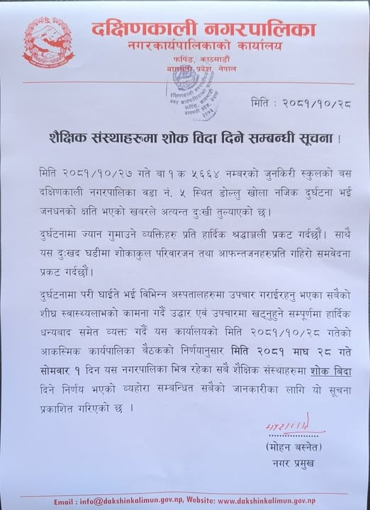 नगरद्वारा जारी विज्ञप्तिमा जनाइए अनुसार हिजो स्थानीय जुनकिरी स्कुलको बस दुर्घटना हुँदा मानवीय एवं भाैतिक क्षति भएको शोकमा आज सोमबार नगरका विद्यालयहरूमा बिदा दिइएको उल्लेख छ ।