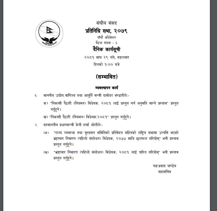 संसद बैठकमा उद्योग, वाणिज्य तथा आपूर्तिमन्त्री दामोदर भण्डारीले निकासी पैठारी (नियमन) विधेयक, २०८१ लाई प्रस्तुत गर्ने सम्भावित कार्यसूची छ ।