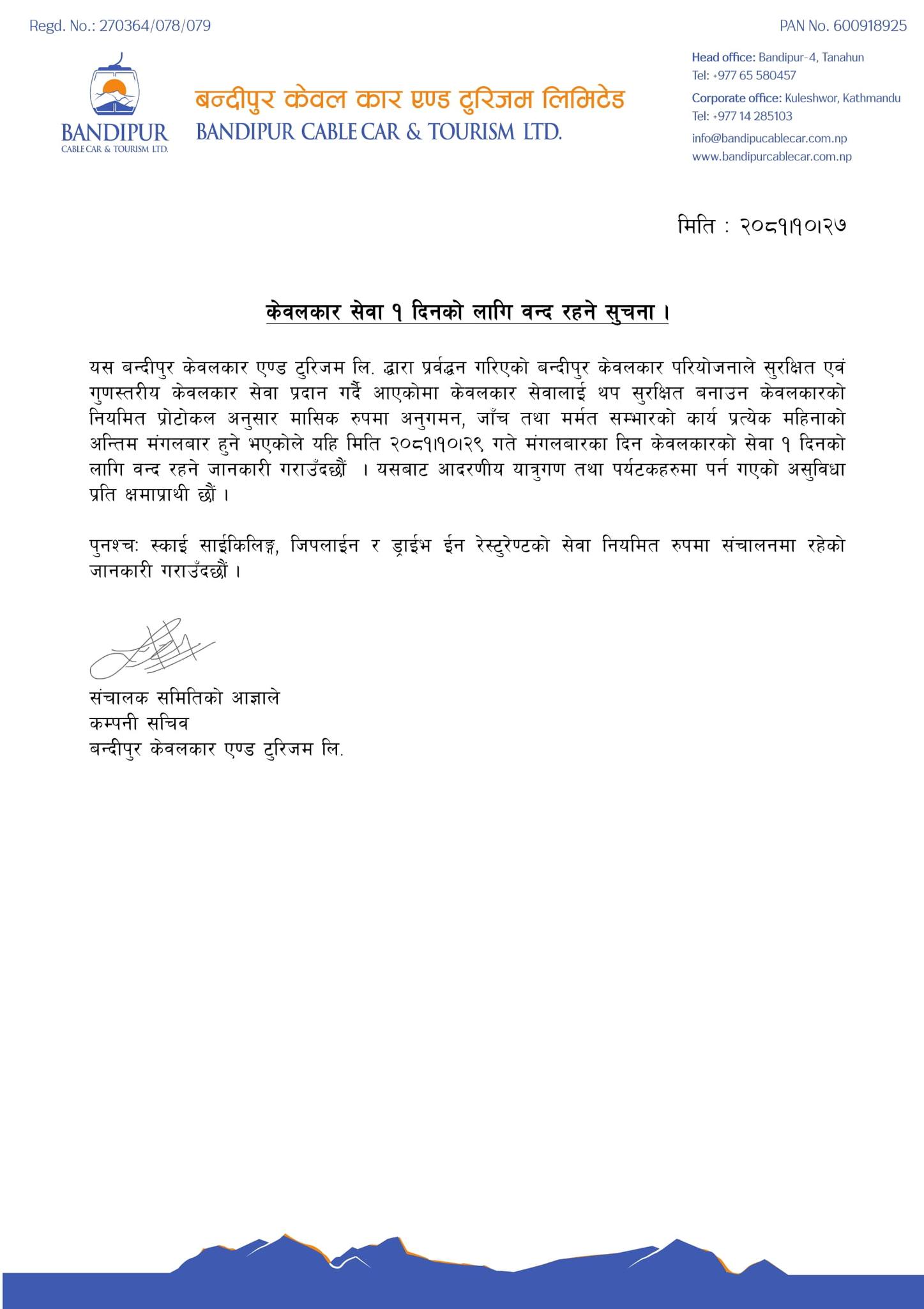 कम्पनीद्वारा जारी विज्ञप्तीमा भनिएको छ आगामी मंगलबार, २०८१/१०/२९ का दिन बन्दीपुर केबलकार एण्ड टुरिज्म लिमिटेडको सेवा १ दिनका लागि अस्थायी रूपमा बन्द रहनेछ। तपाईंहरूमा पर्न जाने असुविधाप्रति हामी क्षमाप्रार्थी छौं। सुरक्षित, भरपर्दो, र प्रभावकारी सेवा सुनिश्चित गर्न आवश्यक प्रत्येक महिना मंगलवार दिन मर्मतसम्भार अनुरूप मर्मत कार्य गरिंदैछ ।