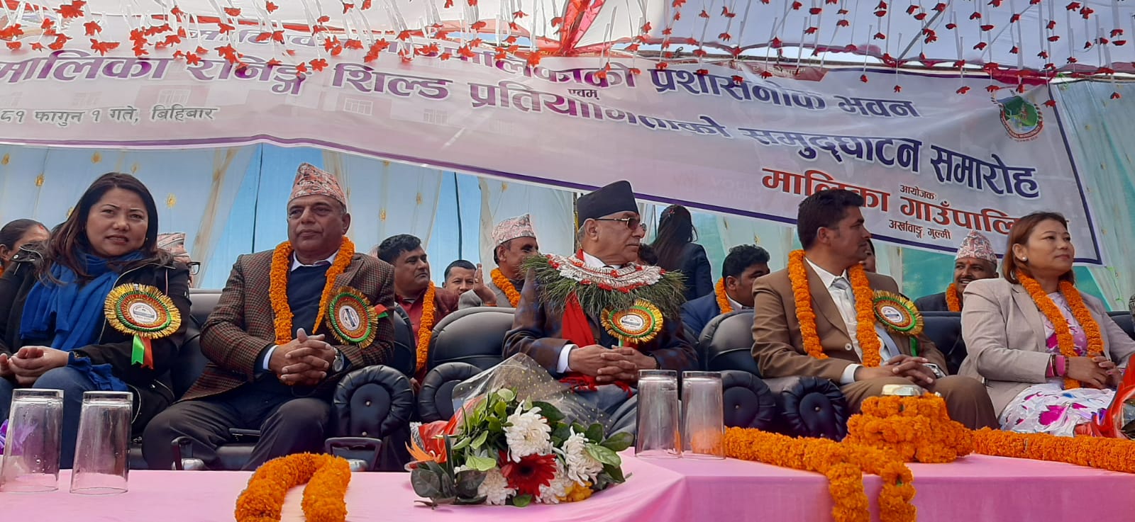 केही समय पछि प्रचण्डले मालिका गाउँपालिकाको नवनिर्मित प्रमुख प्रशासकीय भवनको उद्घाटन गर्दै छन्।