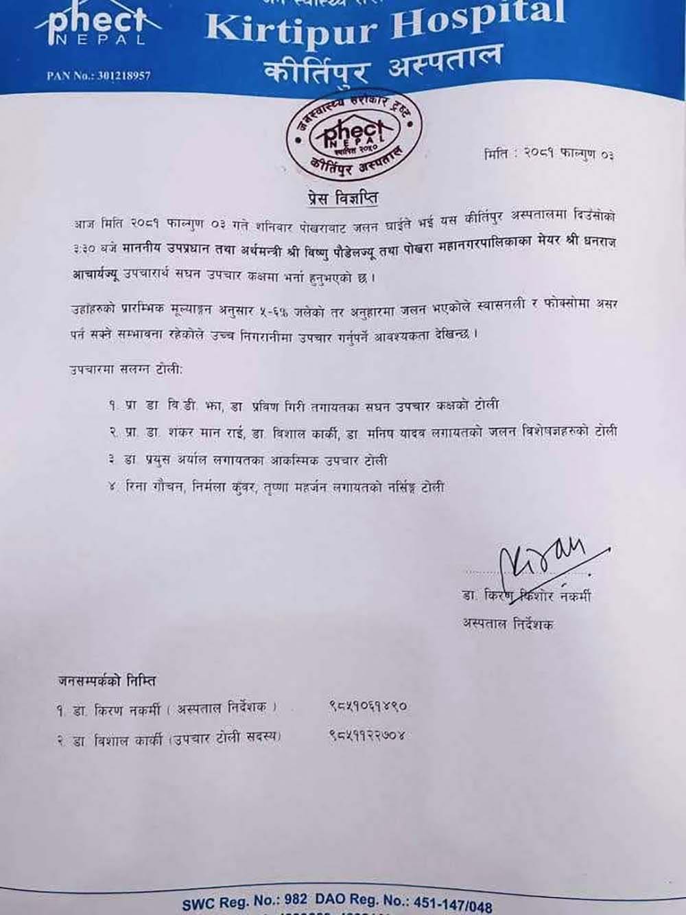 दिउँसो साढे ३ बजेदेखि दुवैको सघन उपचार कक्षमा उपचार भइरहेको अस्पतालका निर्देशक डा. किरण किशोर नकर्मीले जारी गरेको विज्ञप्तिमा उल्लेख छ ।