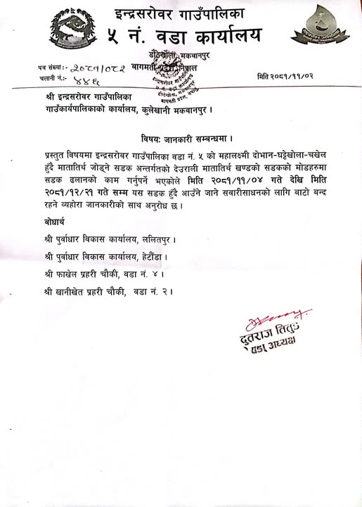 सडकका केही खण्ड स्तरोन्नति एवं ढलान गर्नका लागि फागुन ४ गतेबाट २१ गतेसम्म सडक बन्द गरिएको इन्द्रसरोवर गाउँपालिका वडा नं. ५ बाट जारी सूचनामा उल्लेख छ ।