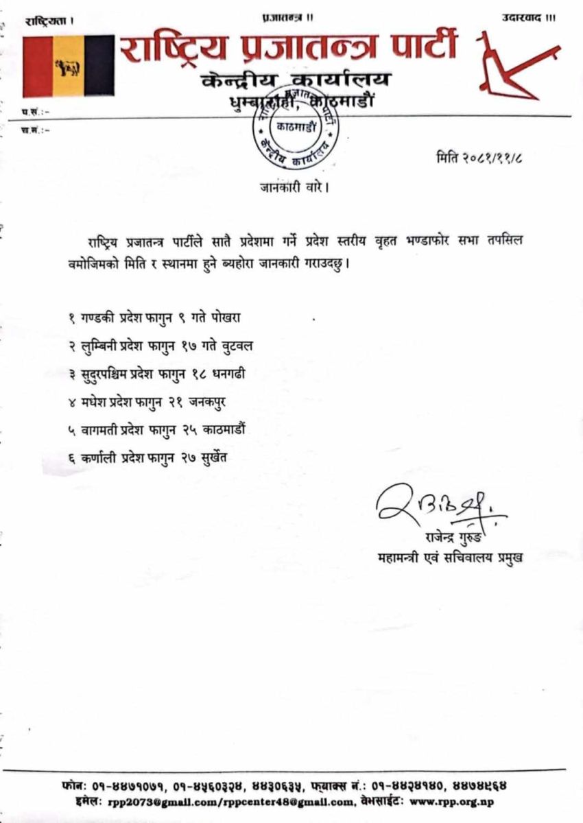 शुक्रबार (भोलि) पोखराबाट सुरु हुने सभा फागुन २७ गते सुर्खेतमा सकिने राप्रपाले जनाएको छ।
