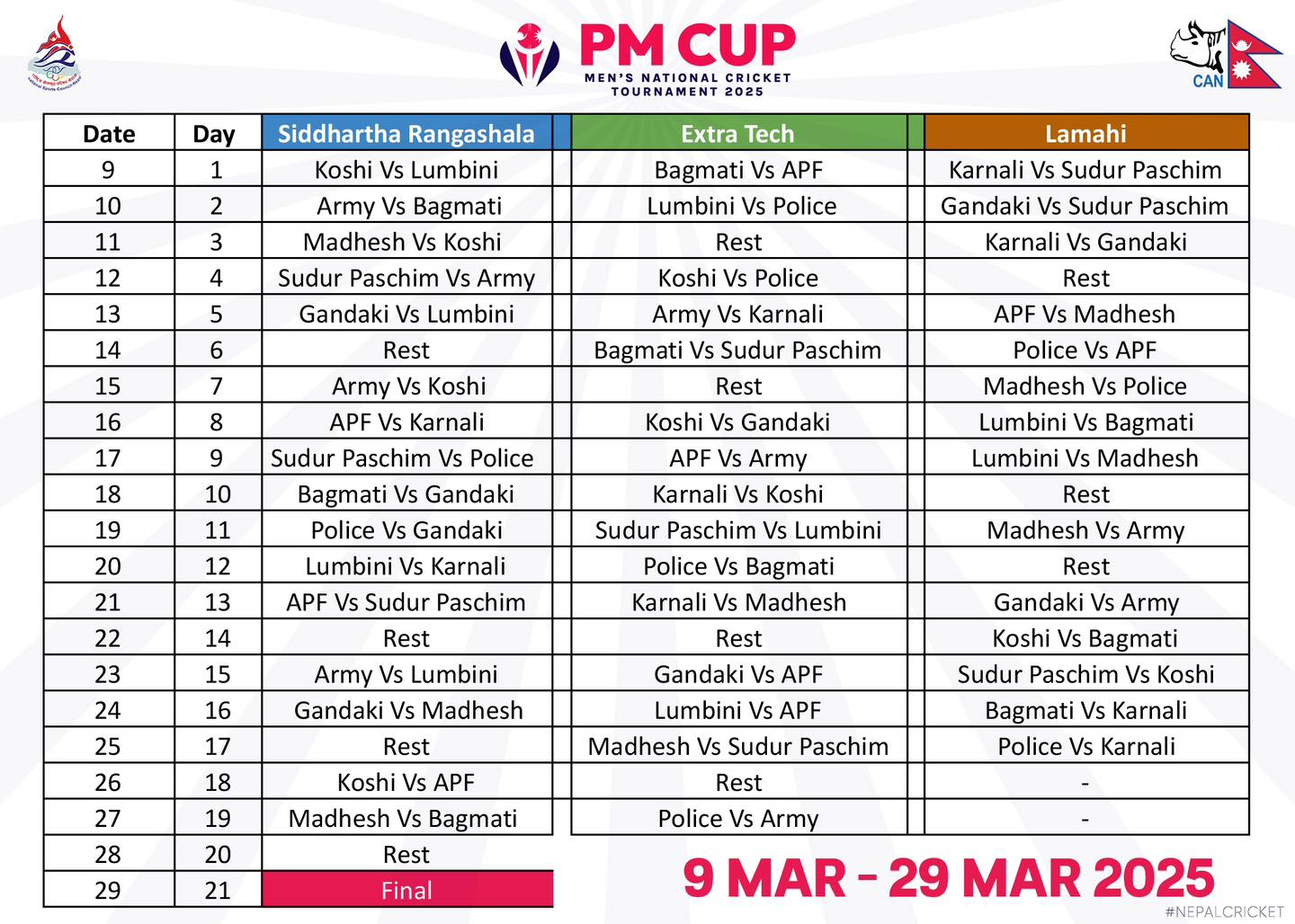 नेपाल क्रिकेट संघ (क्यान)ले शुक्रबार प्रतियोगिताको तालिका सार्वजनिक गरेको हो । तालिकाअनुसार प्रतियोगिताका सबै खेल काठमाडौं बाहिर हुनेछन् । प्रतियोगिताका खेलहरू भैरहवास्थित सिद्धार्थ रंगशाला, एक्ट्राटेक ओभल र दाङस्थित लमही क्रिकेट मैदानमा हुनेछन् ।