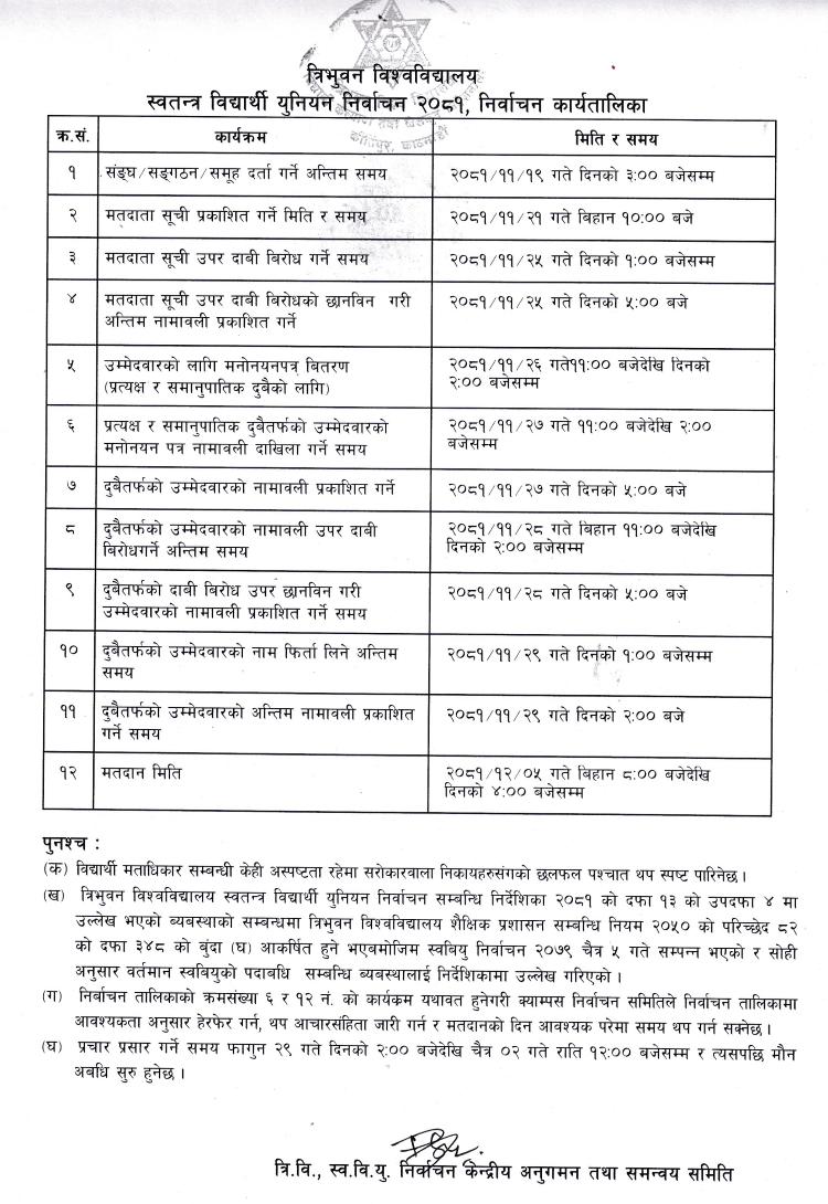 त्रिभुवन विश्वविद्यालयले स्वतन्त्र विद्यार्थी युनियनको निर्वाचन कार्यतालिका सार्वजनिक गरेको छ।