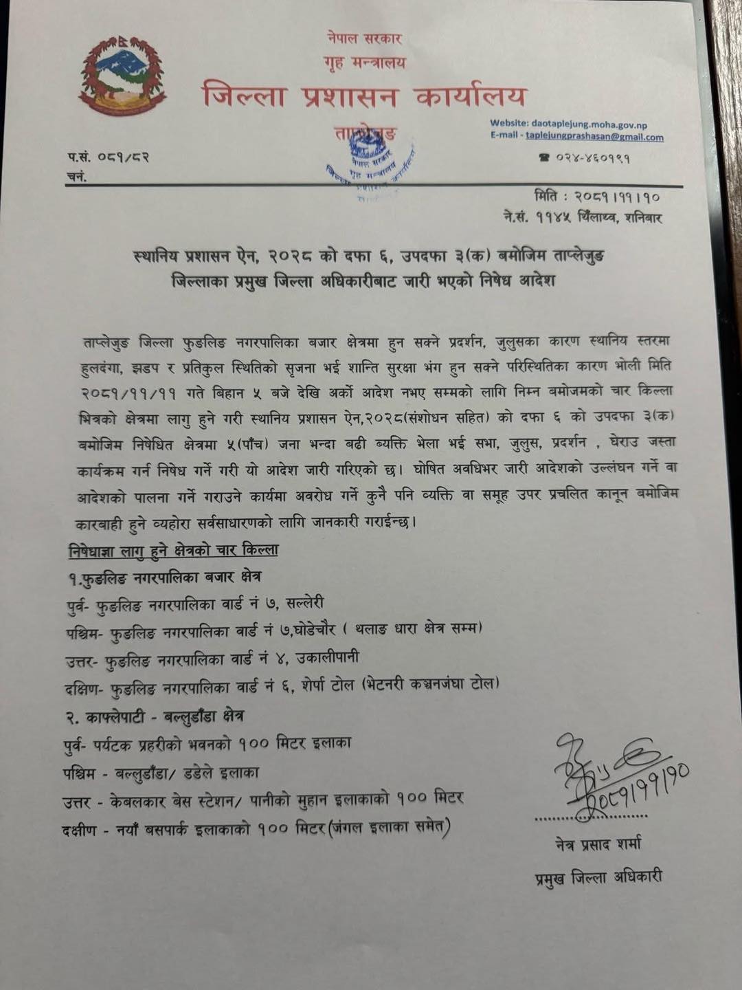 आदेशमा भनिएको छ, ‘‘ताप्लेजुङ जिल्ला फुङलिङ नगरपालिका बजार क्षेत्रमा हुन सक्ने प्रदर्शन, जुलुसका कारण स्थानिय स्तरमा हुलदंगा, झडप र प्रतिकुल स्थितिको सृजना भई शान्ति सुरक्षा भंग हुन सक्ने परिस्थितिका कारण भोली मिति २०८१–११–११ गते बिहान ५ बजेदेखि अर्को आदेश नभएसम्मको लागि निम्नबमोजमको चार किल्लाभित्रको क्षेत्रमा लागु हुने गरी …यो आदेश जारी गरिएको छ।’’