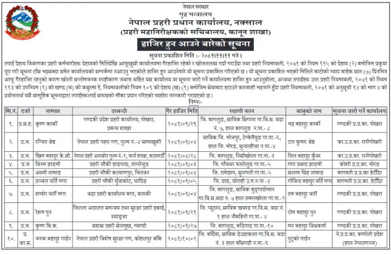 गैर हाजिर रहेका १० प्रहरीलाई ७ दिनभित्र हाजिर हुन निर्देशन (नामावलीसहित)