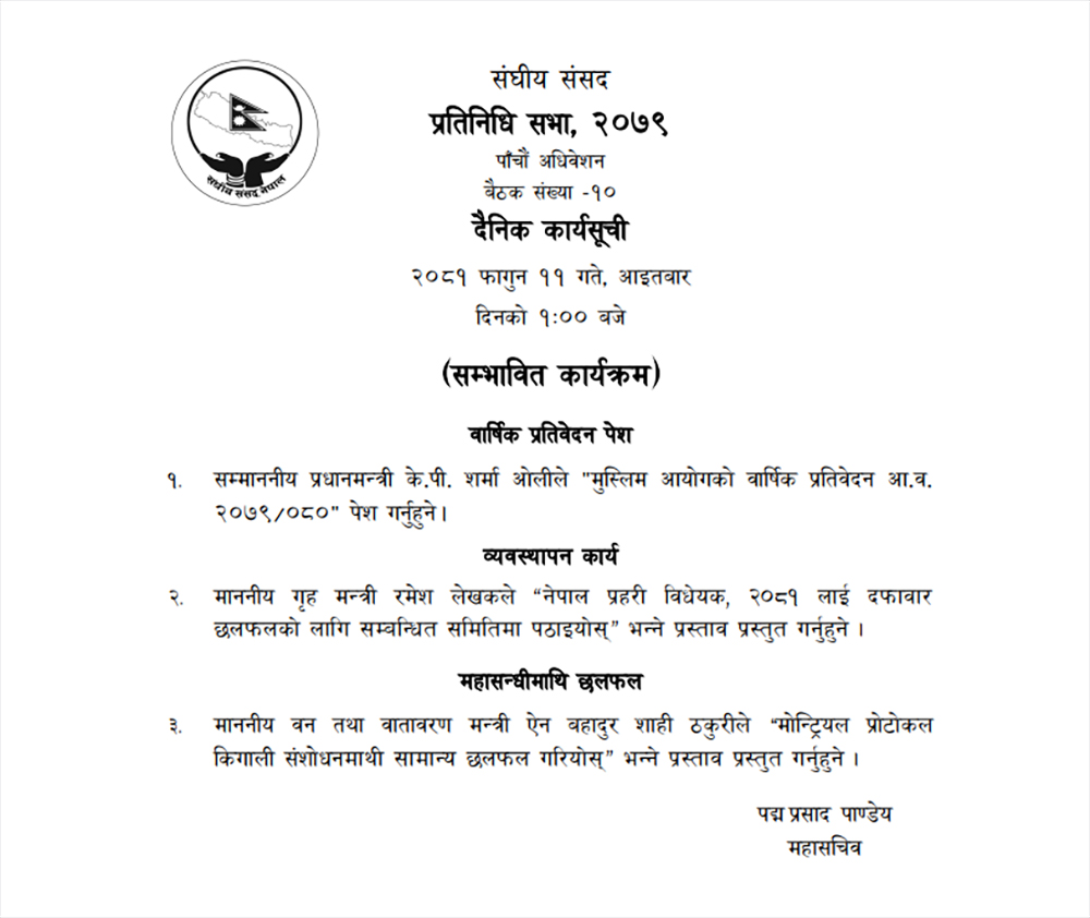 आजको प्रतिनिधि सभा बैठकमा प्रधानमन्त्री केपी शर्मा ओलीले मुस्लिम आयोगको वार्षिक प्रतिवेदन २०७९/२०८० पेस गर्ने, गृह मन्त्री रमेश लेखकले ‘नेपाल प्रहरी विधेयक ,२०८१ लाई दफावार छलफलका लागि सम्बन्धित समितिमा पठाइयोस भनी प्रस्ताव प्रस्तुत गर्ने कार्यसूची छ।