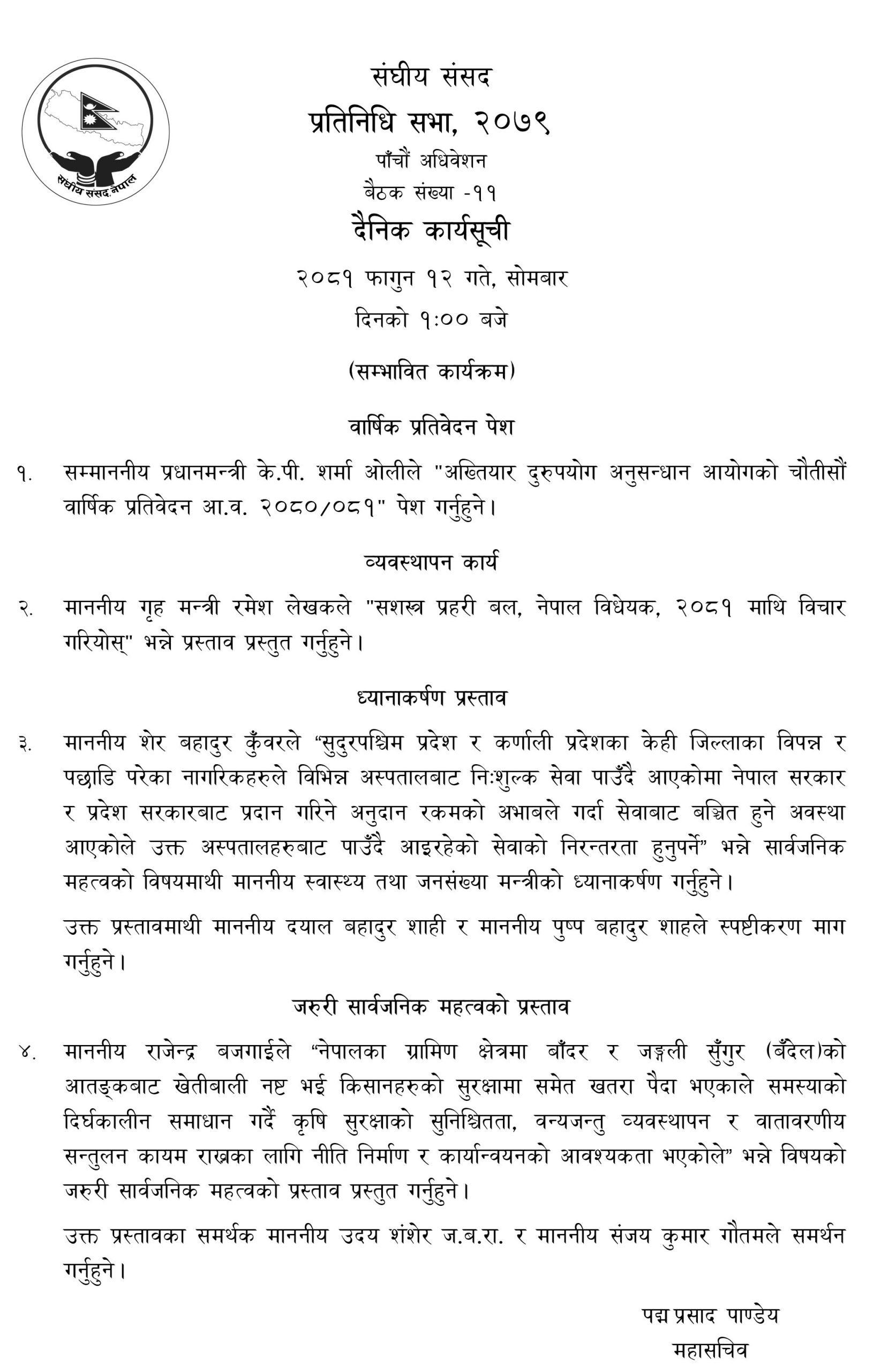 त्यस्तै गृहमन्त्री रमेश लेखकले “सशस्त्र प्रहरी बल, नेपाल विधेयक, २०८१ माथि विचार गरियोस्” भन्ने प्रस्ताव प्रस्तुत गर्नेछन् ।