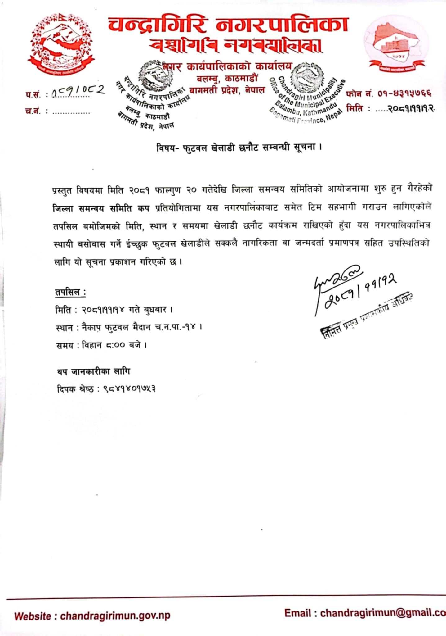 फागुन २० गतेबाट सुरु हुने काठमाडाैं जिल्ला समन्वय समिति कप फुटबल प्रतियोगिताका लागि चन्द्रागिरि नगरपालिकाले खेलाडी छनोट गर्दैछ ।