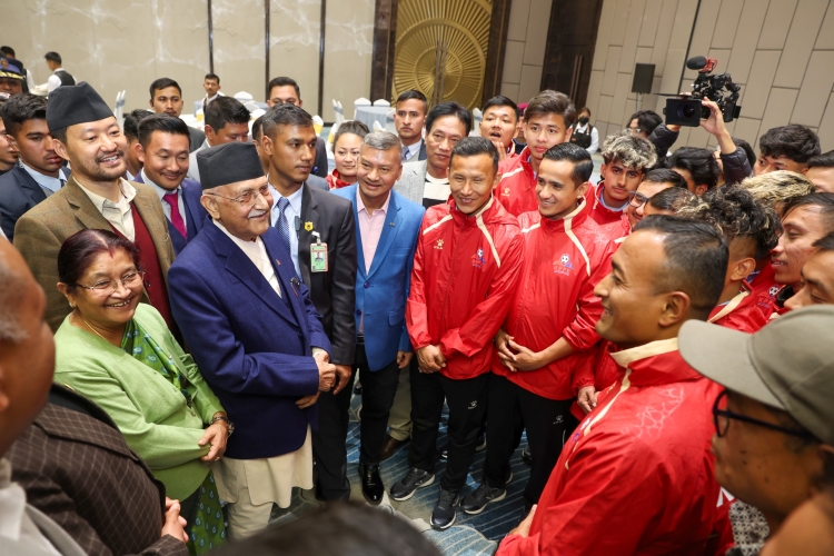 प्रधानमन्त्री ओली र केपी ओली कप फुटबल च्याम्पियनसिपका खेलाडीबीच भेट