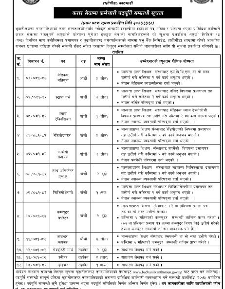 बुढानीलकण्ठ नगरपालिकाको नगर अस्पतालका लागि ३० जना कर्मचारी माग गरिएको छ । नगरपालिकाले आइतबार एक सूचना जारी गर्दै इच्छुक उम्मेदवारले १५ दिनभित्र आवेदन दिन सक्ने उल्लेख गरेको छ ।