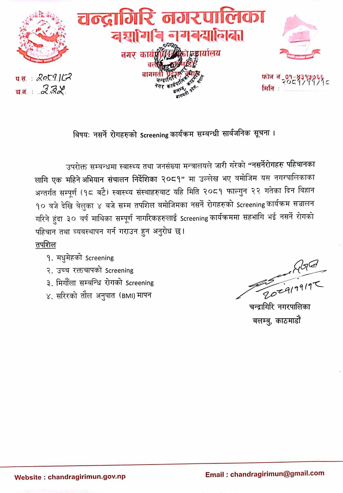स्वास्थ्य तथा जनसंख्या मन्त्रालयले जारी गरेको नसर्ने रोगहरू पहिचानका लागि एक महिने अभियान संचालन निर्देशिका-२०८१ मा उल्लेख भए बमोजिम चन्द्रागिरि नगरका सबै १८ वटै स्वास्थ्य संस्थाहरूबाट सो अभियान सुरु हुन लागेको हो।