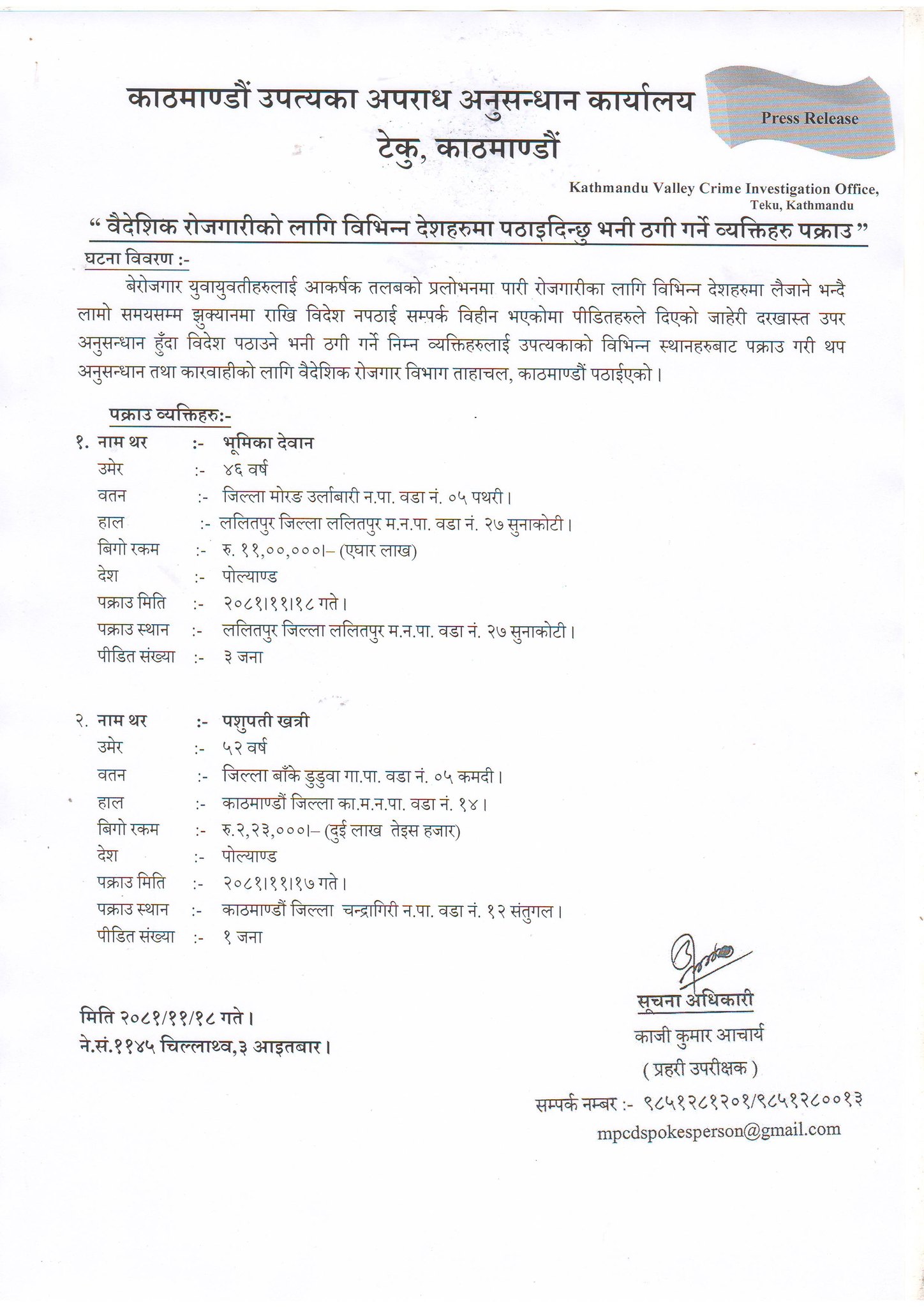 उनी माथि थप अनुसन्धानका लागि वैदेशिक रोजगार विभाग ताहाचल पठाइएको प्रहरी उपरीक्षक काजी कुमार आचार्यले जानकारी दिए ।
