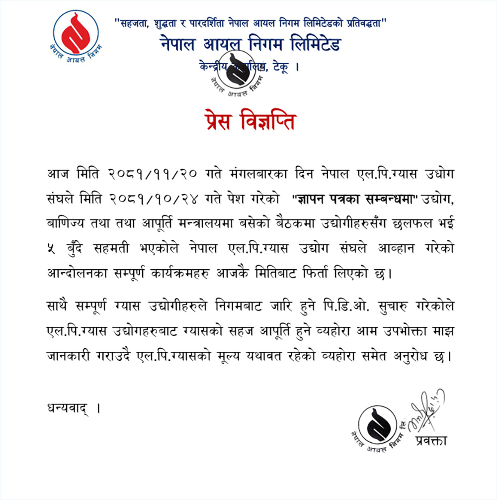 मंगलबार नेपाल एलपी ग्यास उद्योग संघसँग भएको सरकारको सहमतिपछि आन्दोलनका कार्यक्रम फिर्ता भएको जनाउँदै ग्यास उद्योगहरुबाट अब ग्यास सहज उपलब्ध हुने बताएको हो ।
