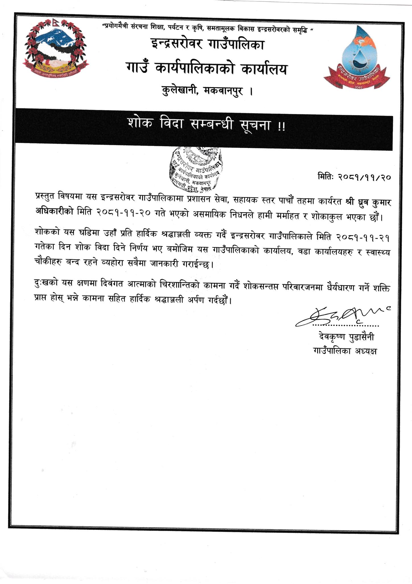 मकवानपुरको इन्द्रसरोवर गाउँपालिकामा आज शोक बिदा दिइएको छ ।