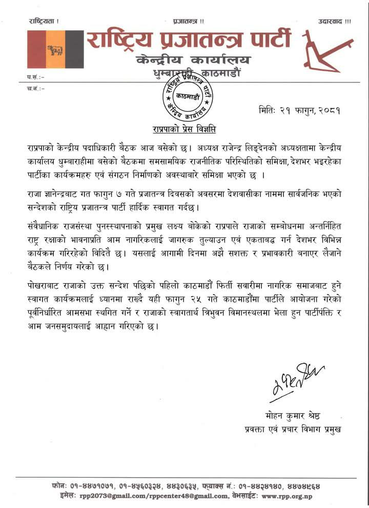 ‘राजा ज्ञानेन्द्रबाट गत फागुन ७ गते प्रजातन्त्र दिवसको अवसरमा देशवासीका नाममा सार्वजनिक भएको सन्देशको राष्ट्रिय प्रजातन्त्र पार्टी हार्दिक स्वागत गर्दछ’ बैठकपछि मोहनकुमार श्रेष्ठले जारी गरेको विज्ञप्तिमा उल्लेख छ।