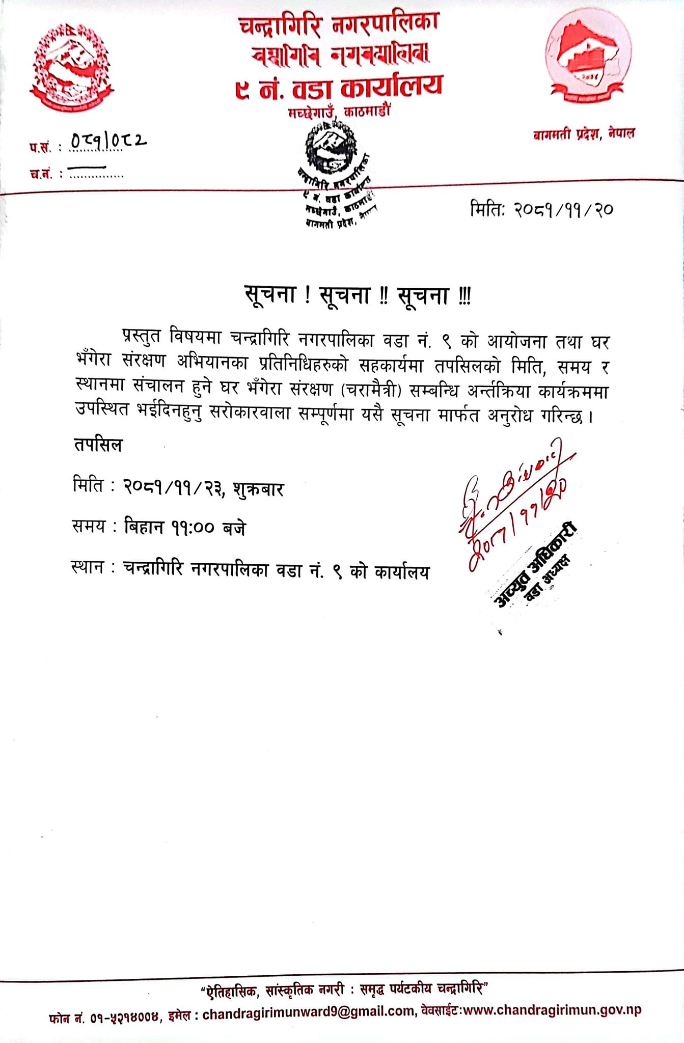 चरा संरक्षणका लागि चन्द्रागिरि नगरपालिका वडा नं. ९ मच्छेगाउँले अन्तर्क्रिया कार्यक्रम गर्ने भएको छ ।