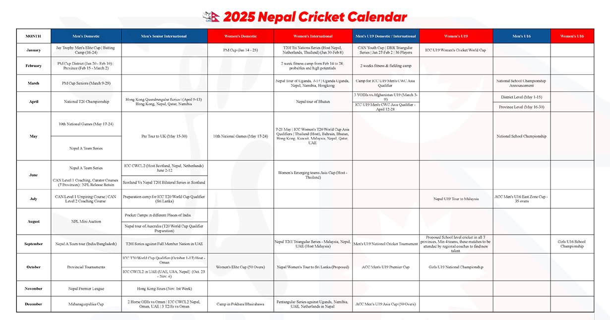 नेपाल क्रिकेट संघ (क्यान)ले वार्षिक क्यालेण्डर सार्वजनिक गरेको छ ।