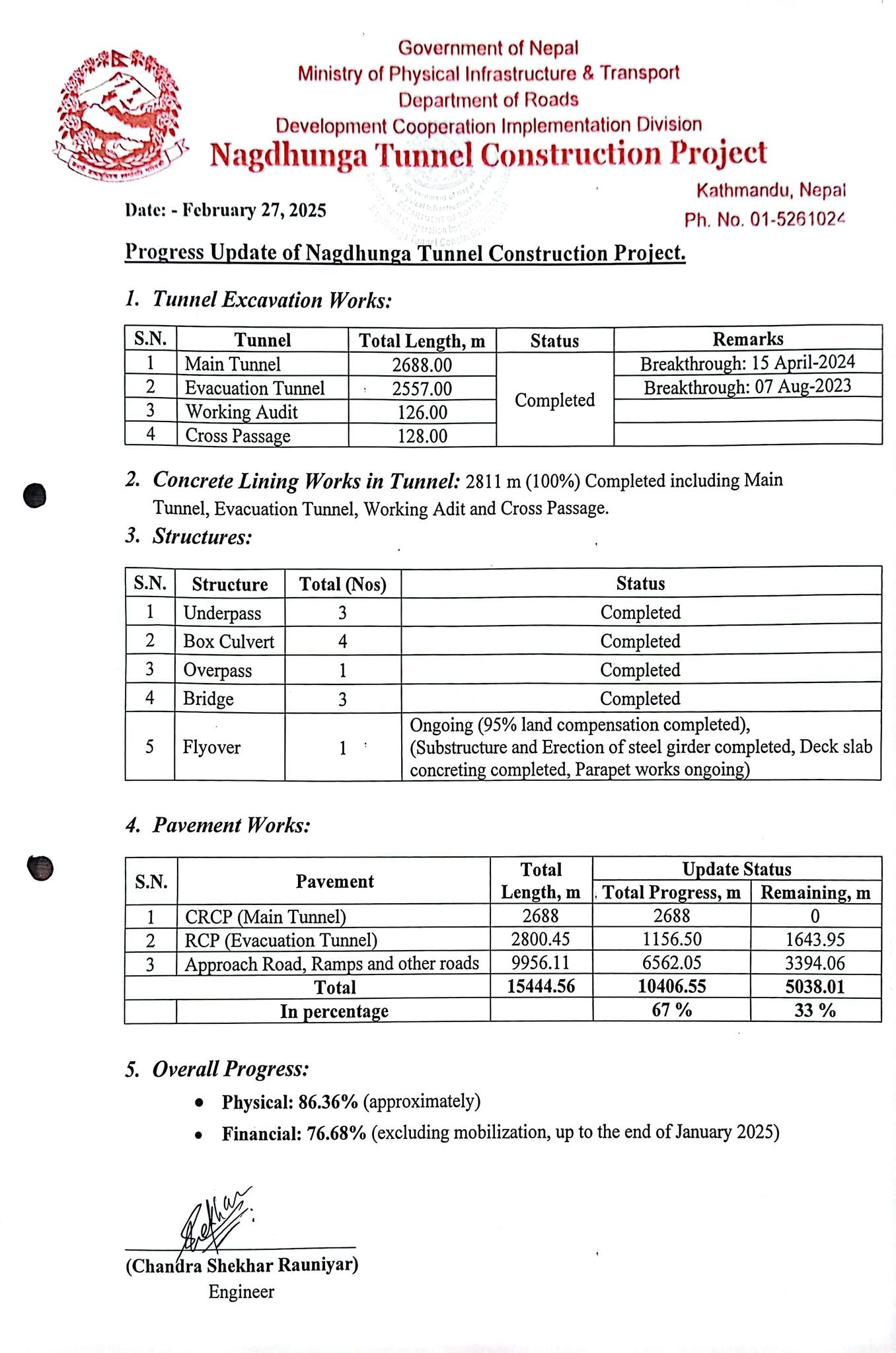 राष्ट्रिय गाैरवको परियोजना नागढुंगा सुरूङ मार्गको काम ८६ प्रतिशत सम्पन्न भएको छ।