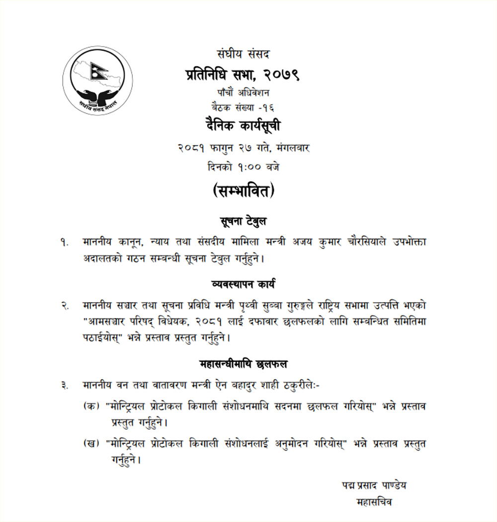 वन तथा वातावरणमन्त्री ऐन बहादुर शाही ठकुरीले मोन्ट्रियल प्रोटोकल किगाली संशोधनमाथि सदनमा छलफल र अनुमोदनका लागि प्रस्तुत गर्ने सम्भावित कार्यसूची रहेको संसद् सचिवालयले जनाएको छ ।