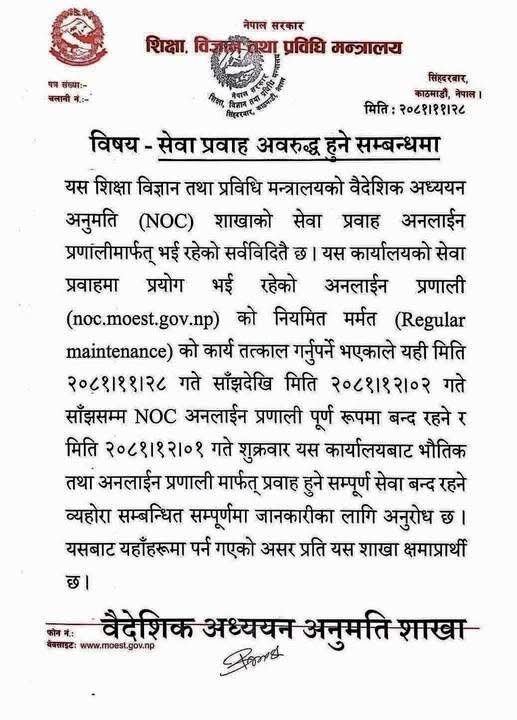अनलाइनबाट सेवा दिँदै आएको मन्त्रालयको एनओसी शाखाले मर्मतका लागि २ चैतसम्म एनओसी पूर्णरूपमा बन्द हुने जनाएको हो ।