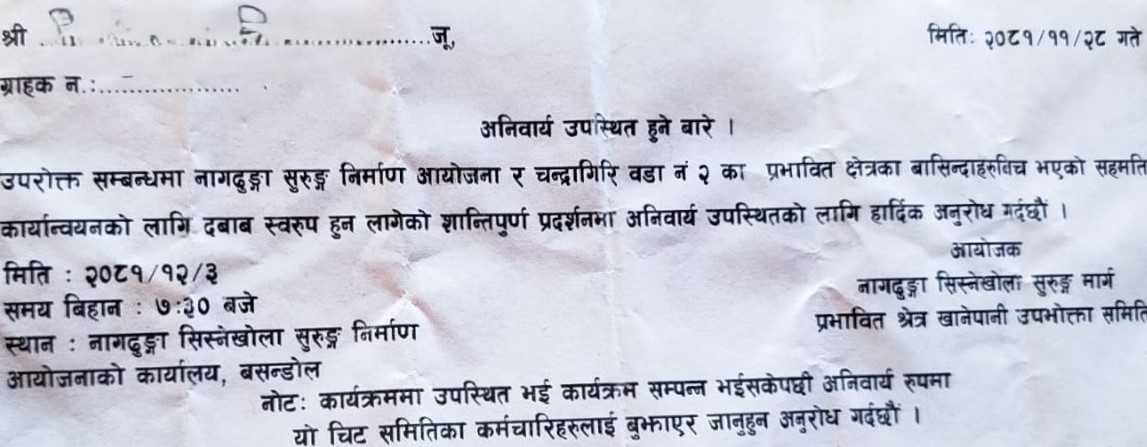 नागढुङ्गा सुरुङ्ग निर्माण आयोजना र चन्द्रागिरि वडा नं २ का प्रभावित क्षेत्रका बासिन्दाहरुबीच भएको सहमति कार्यान्वयनको लागि दबाब स्वरुप आइतबारबाट शान्तिपूर्ण प्रदर्शन गर्न लागिएको नागढुङ्गा सिस्नेखोला सुरुङ्ग निर्माण प्रभावित क्षेत्र खानेपानी उपभोक्ता समितिले जनाएको छ ।