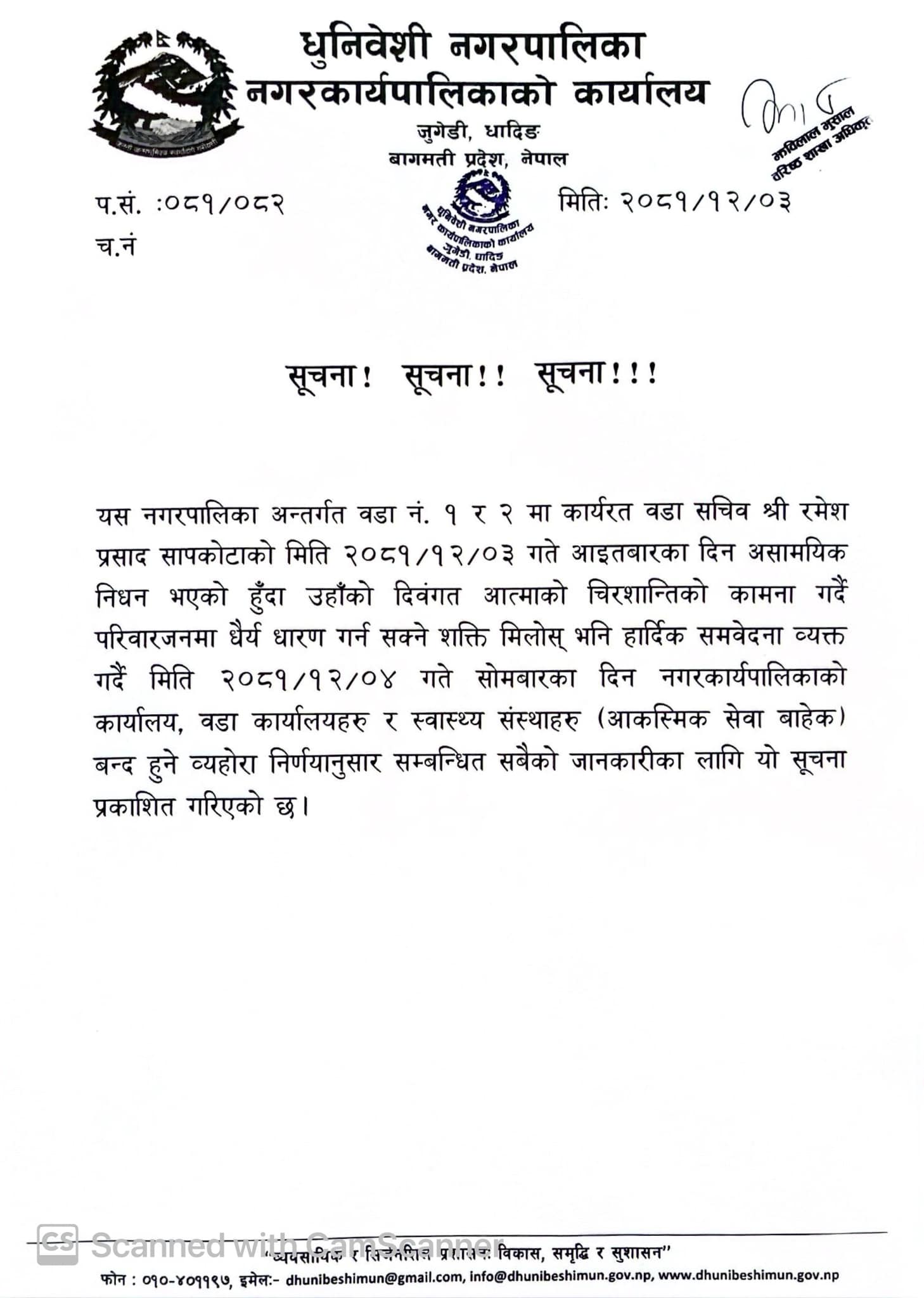 नगरको वडा नं. १ र २ मा कार्यरत वडा सचिव रमेश प्रसाद सापकोटाको निधन भएको शोकमा नगरपालिकाले आज सोमबार नगरक्षेत्रमा बिदा दिएको हो ।