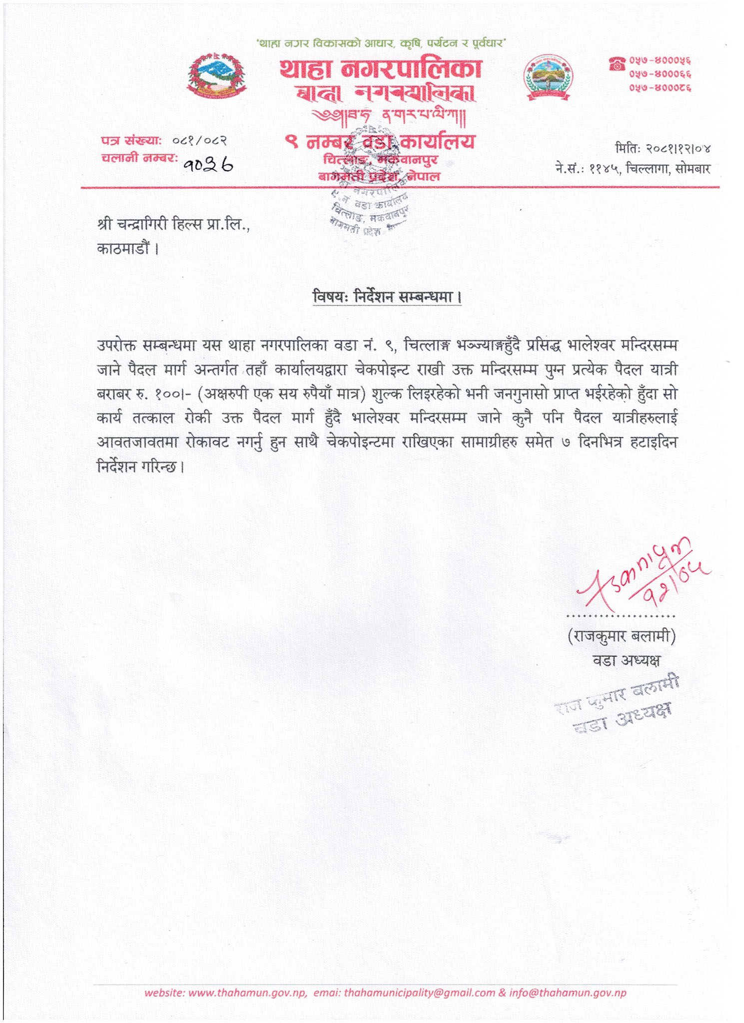 चन्द्रागिरि केबलकारको प्रवर्द्धक चन्द्रागिरि हिल्सले चन्द्रागिरि नगरपालिका र थाहा नगरपालिकाको सीमा क्षेत्र चित्लाङ देउराली भन्ज्याङ्ग हुँदै भालेश्वर मन्दिर पुगिने पदमार्गमा ढाट राखेर प्रवेश शुल्क लिएको विषयमा चन्द्रागिरि नगरपालिका वडा नं. ४ थानकोटले ध्यानाकर्षण भएको जनाएको छ।