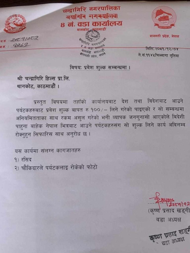 चन्द्रागिरि वनमा प्रवेश गर्दा शुल्क लिएको विषयमा चन्द्रागिरि वडा नंं ४ कार्यालयको ‘एक्सन’