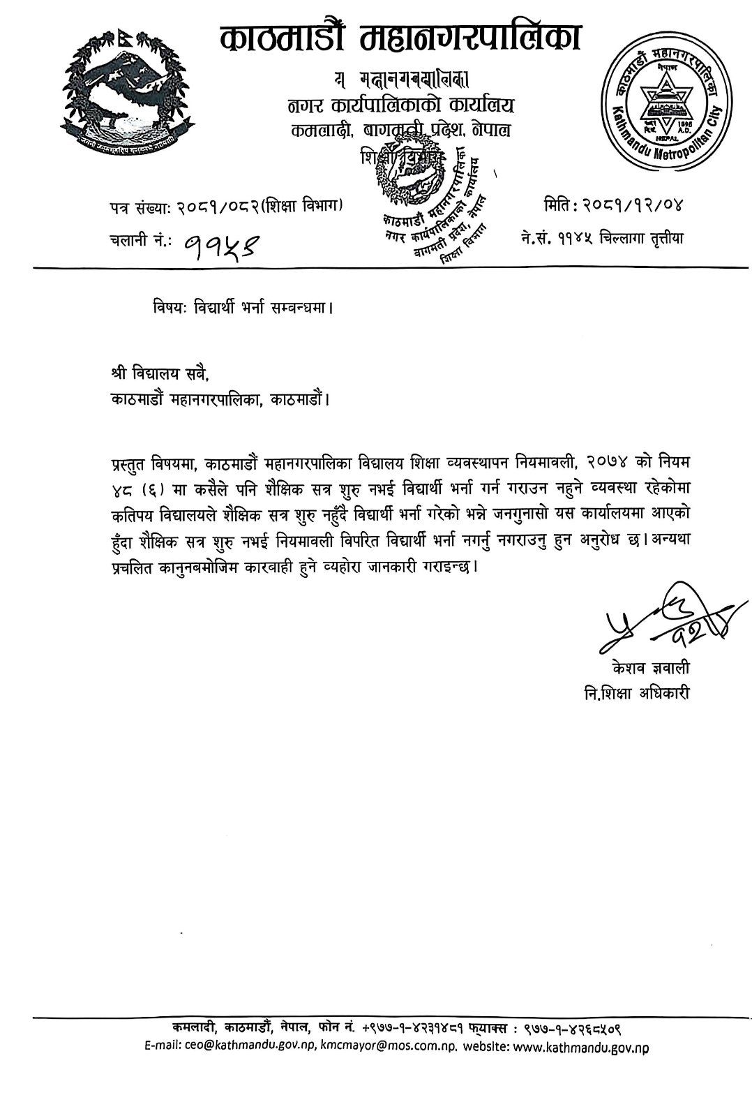 काठमाडौं महानगरपालिकाले विद्यालयले शैक्षिक सत्र सुरु नभई विद्यार्थी भर्ना नगर्न/नगराउन आग्रह गरेको छ ।