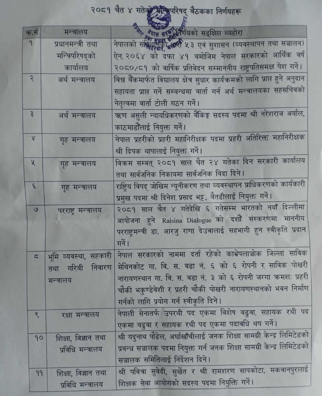 यस्ता छन मन्त्रिपरिषद् बैठकका निर्णयहरूः