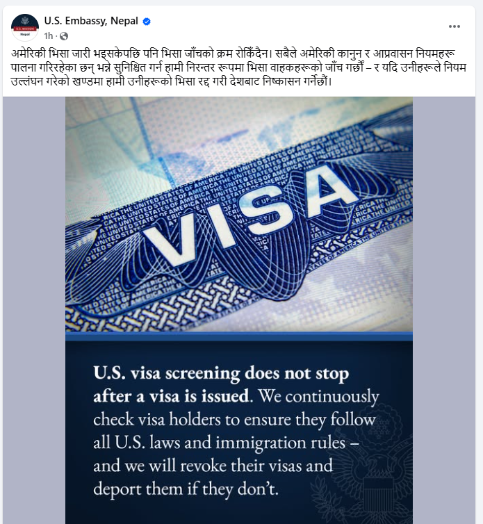 ‘अमेरिकी भिसा जारी भइसकेपछि पनि भिसा जाँचको क्रम रोकिँदैन। सबैले अमेरिकी कानुन र आप्रवासन नियमहरू पालना गरिरहेका छन् भन्ने सुनिश्चित गर्न हामी निरन्तर रूपमा भिसा वाहकहरूको जाँच गर्छौं – र यदि उनीहरूले नियम उल्लंघन गरेको खण्डमा हामी उनीहरूको भिसा रद्द गरी देशबाट निष्कासन गर्नेछौं,’ दूतावासले भनेको छ ।