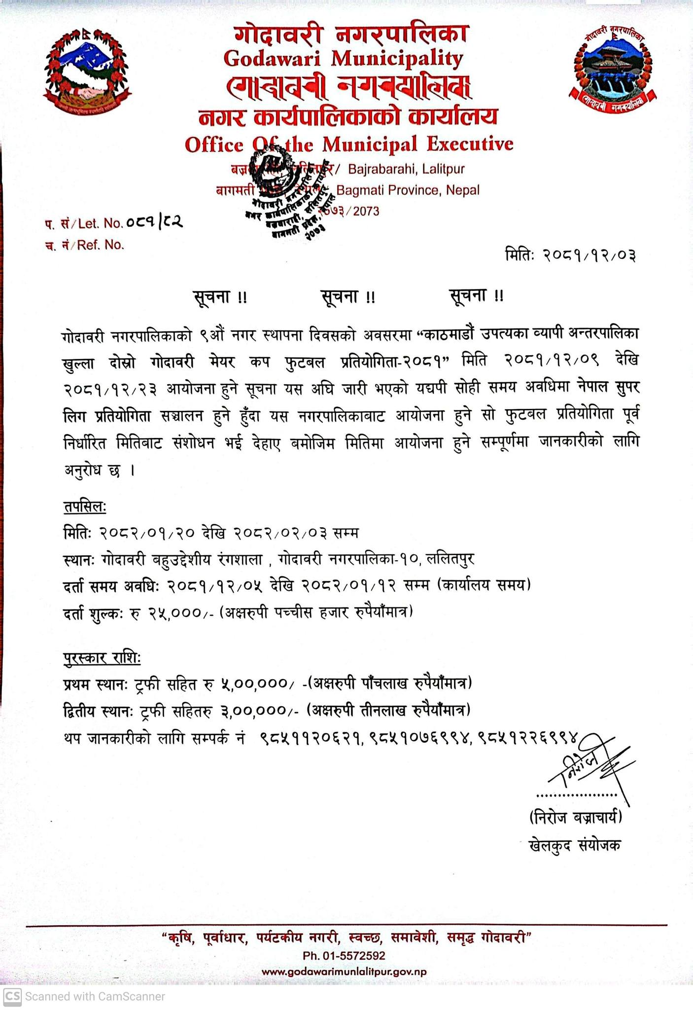 दोश्रो गोदावरी मेयर कप फुटबल प्रतियोगिता २०८२ बैशाख २० बाट, टिम दर्ता शुल्क २५ हजार