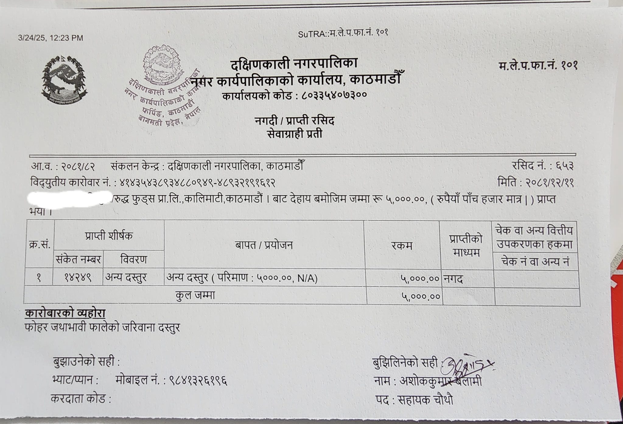 स्थानीय हात्तीवनमा आइतबार राति गाडीबाट फोहोर फालिरहेको अवस्थामा नगरप्रहरी बलले फेला पारेपछि सो जरिवाना तिराइएको दक्षिणकाली नगरपालिकाले जनाएको छ ।