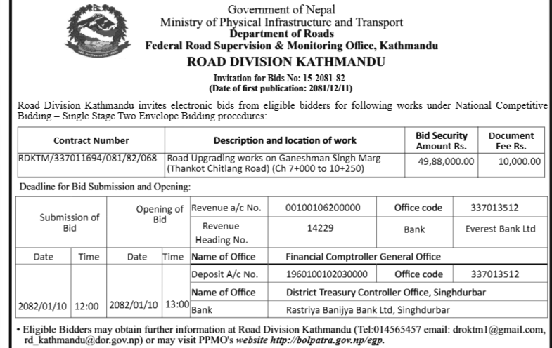 सडक डिभिजन कार्यालय काठमाडौंले गणेशमान सिंह मार्ग (थानकोट-चन्द्रागिरि चित्लाङ सडक)को स्तरोन्नतिका लागि टेण्डर आह्वान गरेको छ ।
