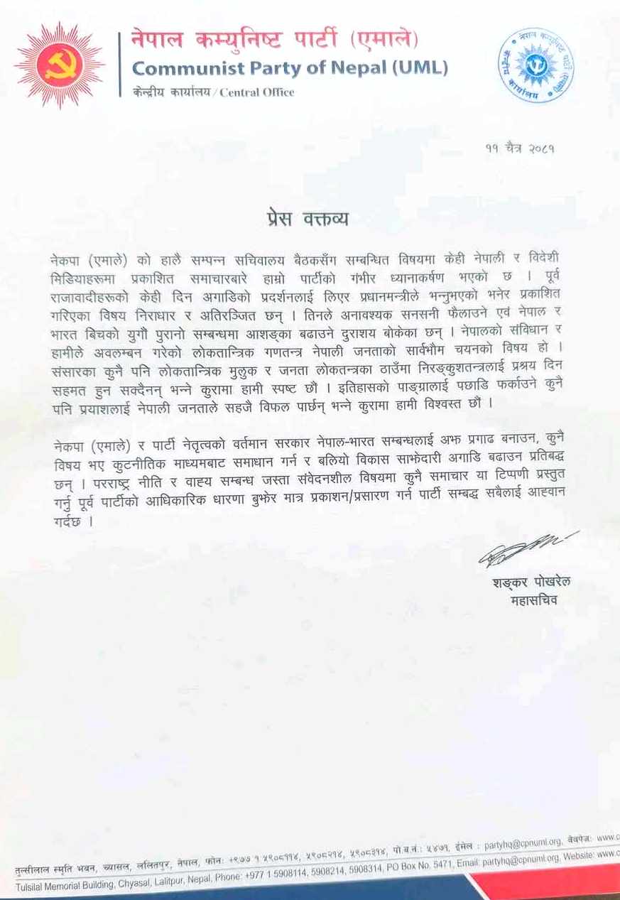 नेकपा एमालेले पार्टी सचिवालय बैठकका विषयमा केही नेपाली र विदेशी मिडियाहरूमा प्रकाशित समाचारबारे गम्भीर ध्यानाकर्षण भएको जनाएको छ । पार्टी महासचिव शङ्कर पोखरेलले सोमबार एक विज्ञप्ति जारी गर्दै पूर्व राजावादीहरुको केही दिनअघिको प्रदर्शनलाई लिएर प्रधानमन्त्री केपी शर्मा ओलीले भनेका भनेर प्रकाशित समाचार निराधार र अतिरञ्जित भएको भन्दै पार्टीको गम्भीर ध्यानाकर्षण भएको जनाएका हुन् ।