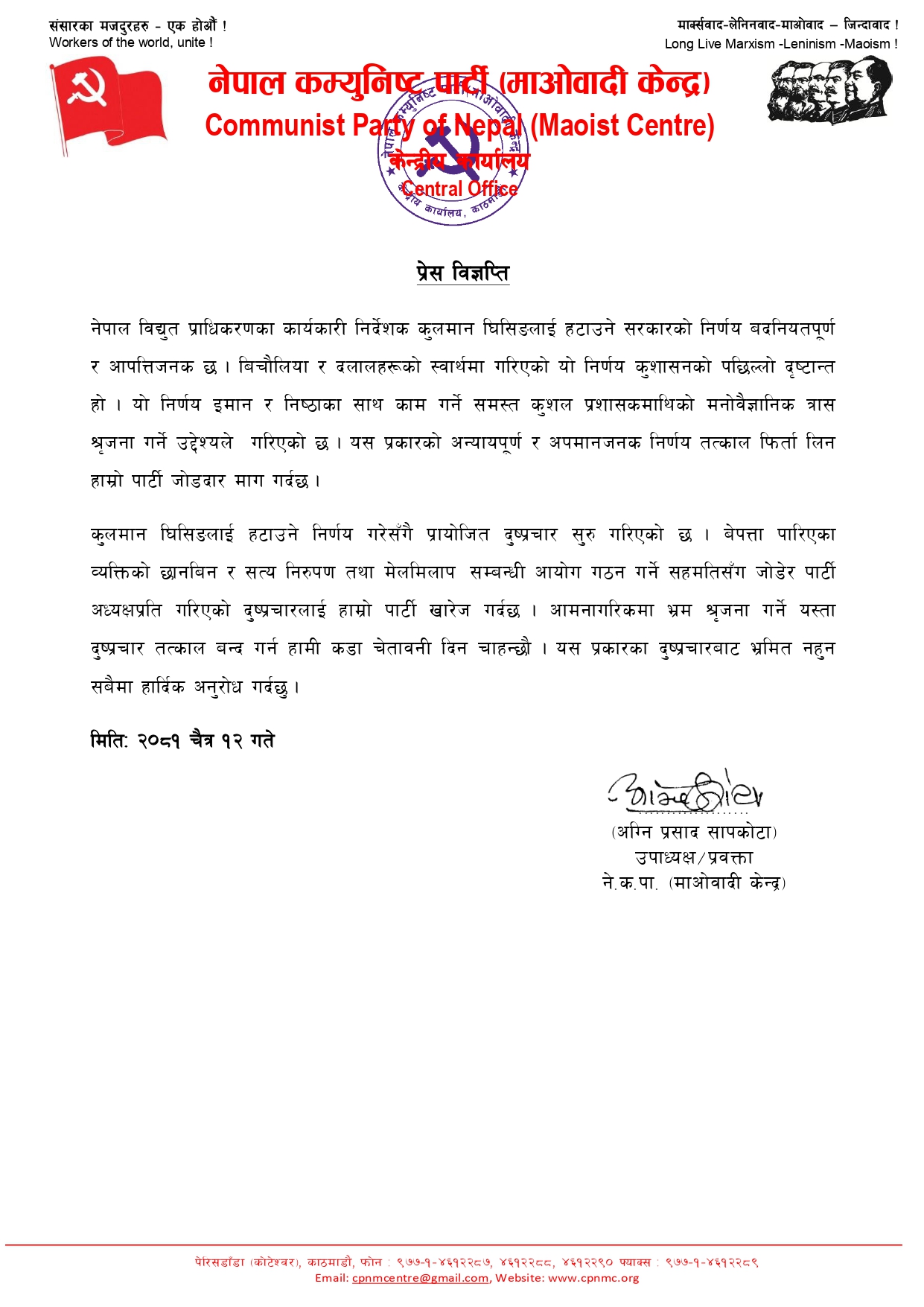 माओवादी केन्द्रले उक्त निर्णय तत्काल फिर्ता लिन माग पनि गरेको छ ।
