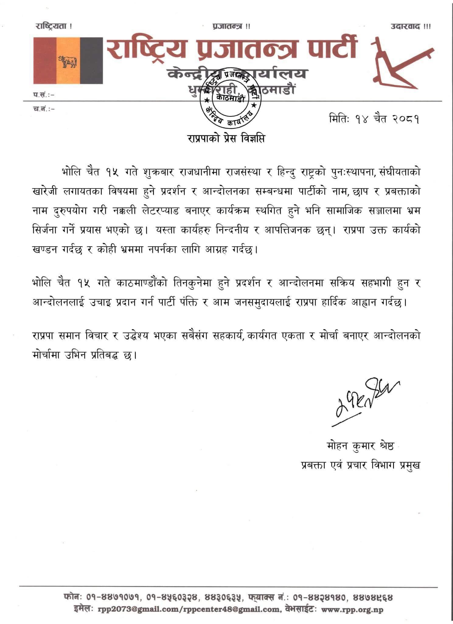विज्ञप्तिमा भनिएको छ ‘भोलि चैत १५ गते काठमाडौंको तिनकुनेमा हुने प्रदर्शन र आन्दोलनमा सक्रिय सहभागी हुन र आन्दोलनलाई उचाइ प्रदान गर्न पार्टी पंति र आम जनसमूदायलाई राप्रपा हार्दिक आह्वान गर्दछ ।’