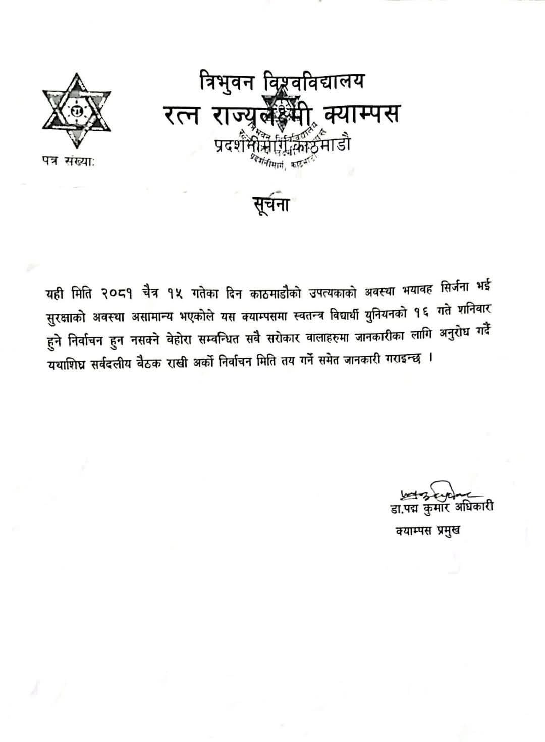 रत्नराज्य लक्ष्मी क्याम्पसमा आज हुने भनिएको स्ववियु निर्वाचन स्थगित