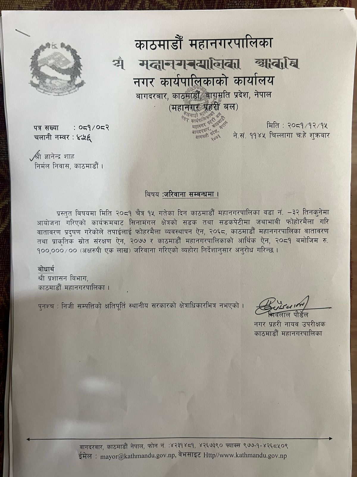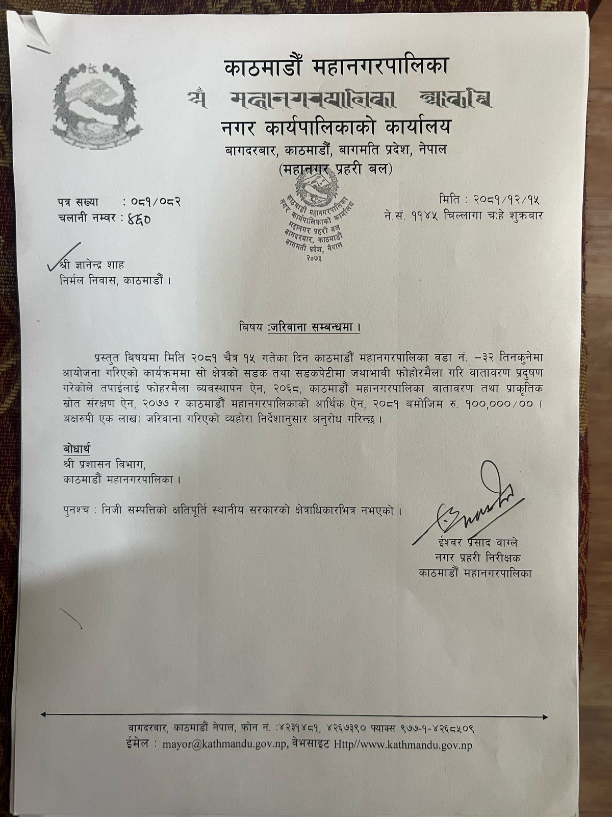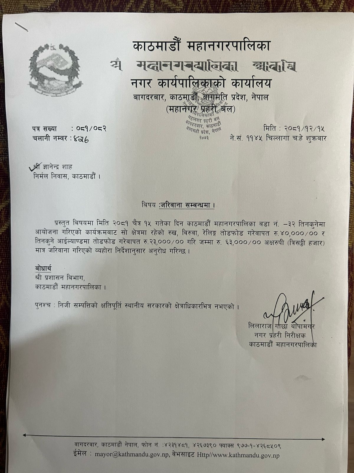 ज्ञानेन्द्र शाह, निर्मल निवास काठमाडौंका नाममा महानगरका ८ जना नगर प्रहरीले ८ वटा बेग्लाबेल्लै पत्र काटेर कुल ७ लाख ९३ हजार जरिवाना तोकेका हुन्।