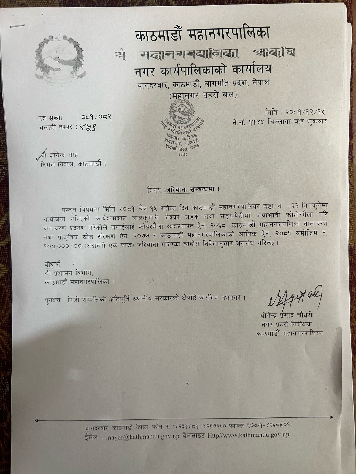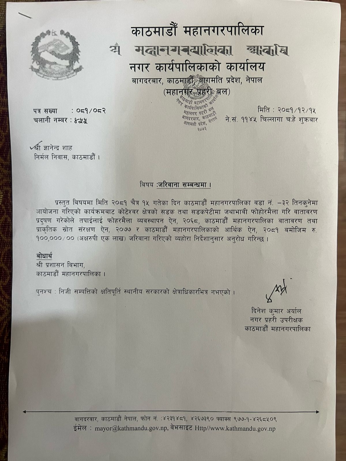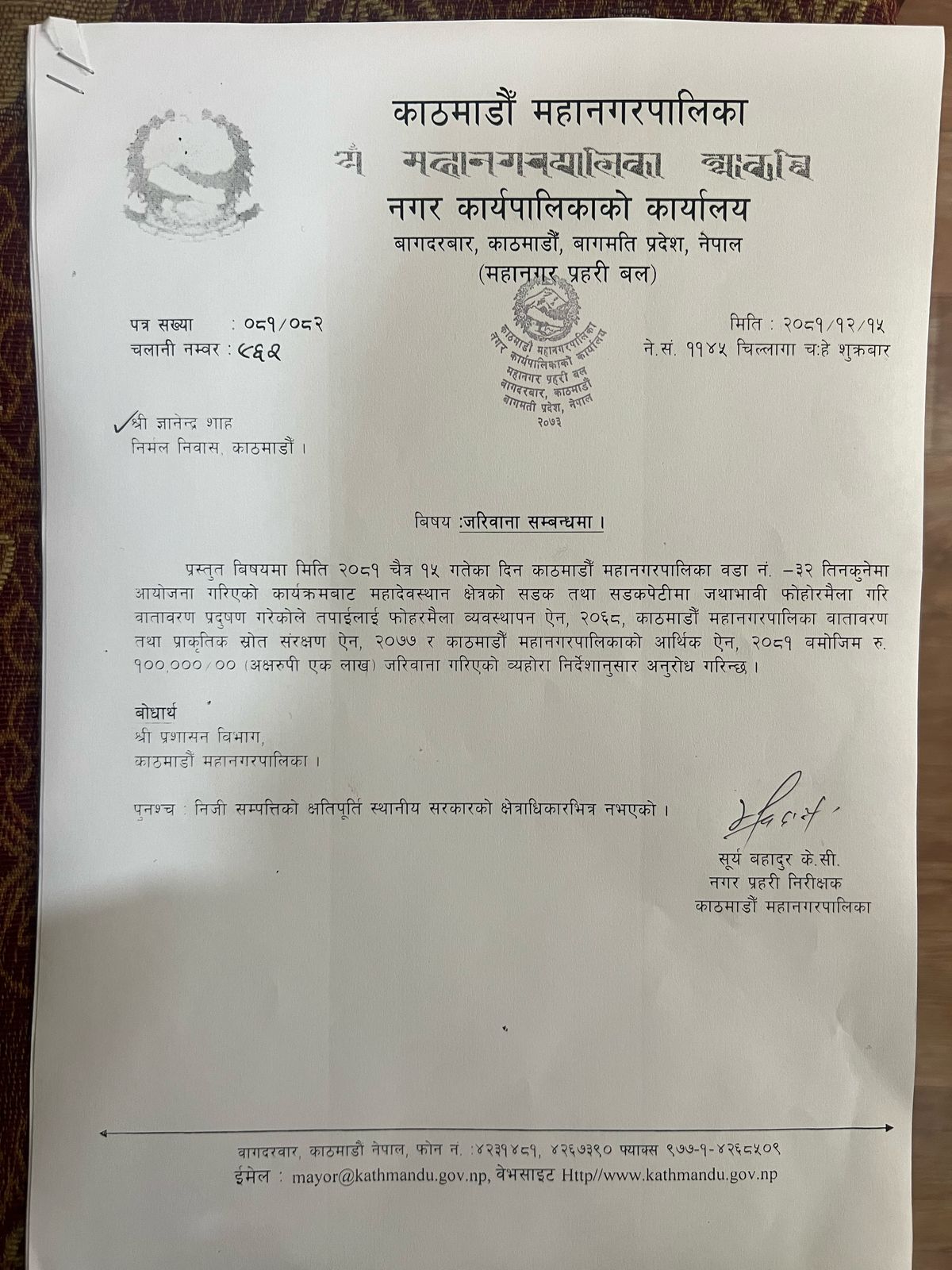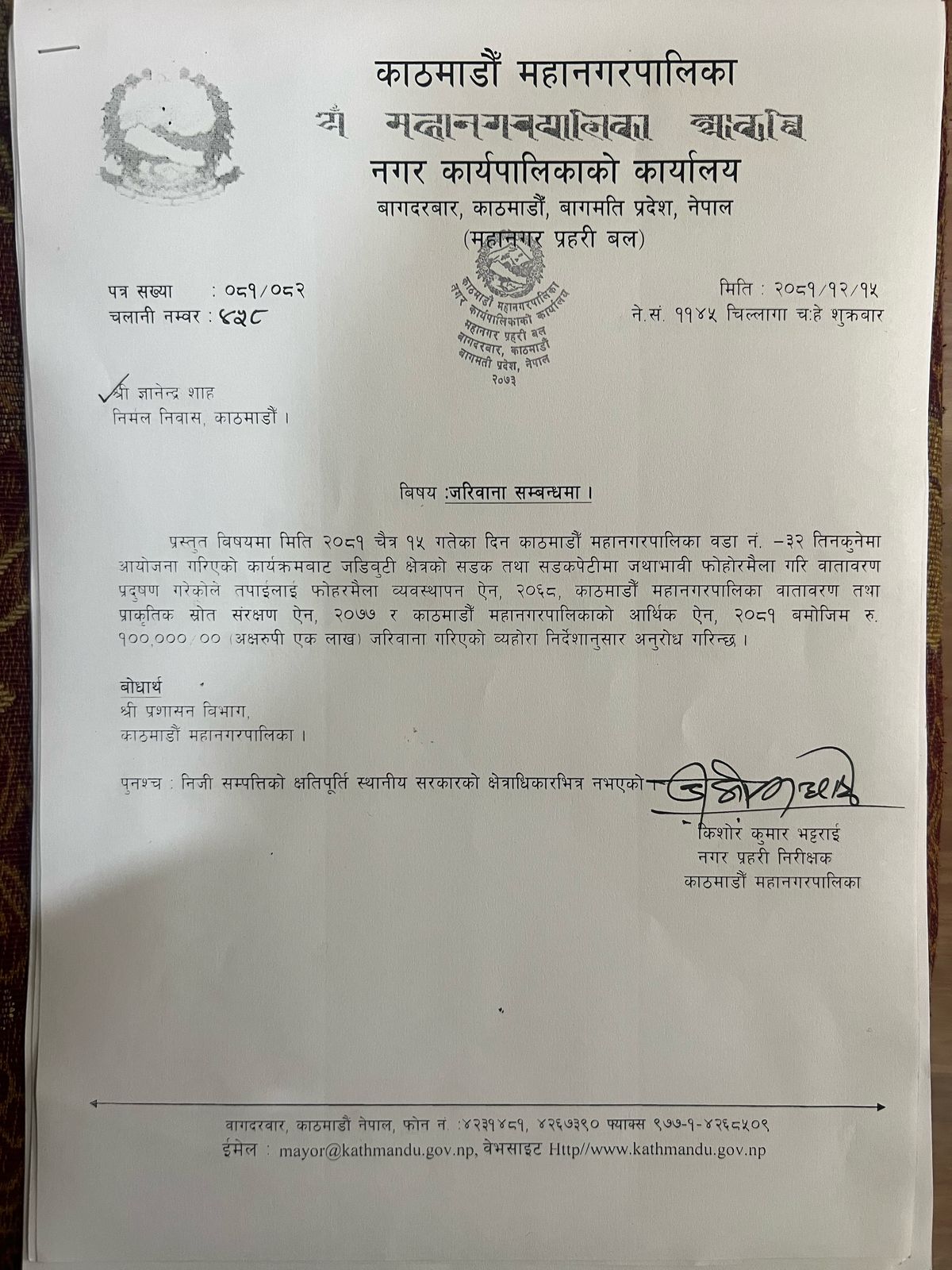 ज्ञानेन्द्र शाह, निर्मल निवास काठमाडौंका नाममा महानगरका ८ जना नगर प्रहरीले ८ वटा बेग्लाबेल्लै पत्र काटेर कुल ७ लाख ९३ हजार जरिवाना तोकेका हुन्।
