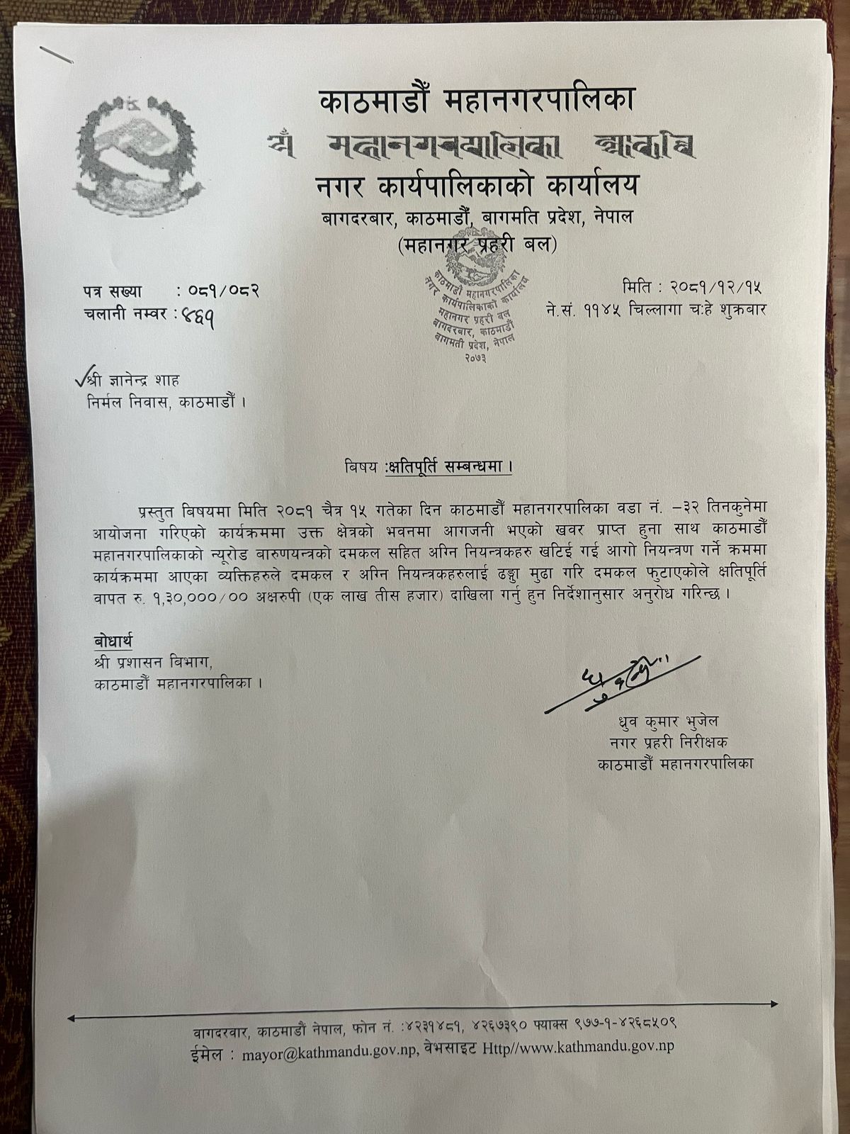 शनिबार काठमाडौं महानगरपालिकाको टोलीले तीनकुने-कोटेश्वर-जडिबुटी क्षेत्रमा भएको क्षतिको विवरण संकलन गरेको थियो। उक्त विवरण संकलन गरी लाग्ने खर्च र सरसफाइको शुल्क पनि पूर्वराजा शाहबाटै असुल गराउने निर्णय भएको हो।