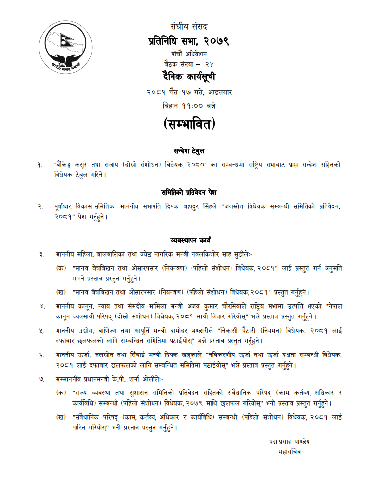 प्रतिनिधिसभा बैठक बिहान ११ बजे बस्नेछ भने राष्ट्रियसभा बैठक दिउसो १ः१५ बजे बस्नेछ ।