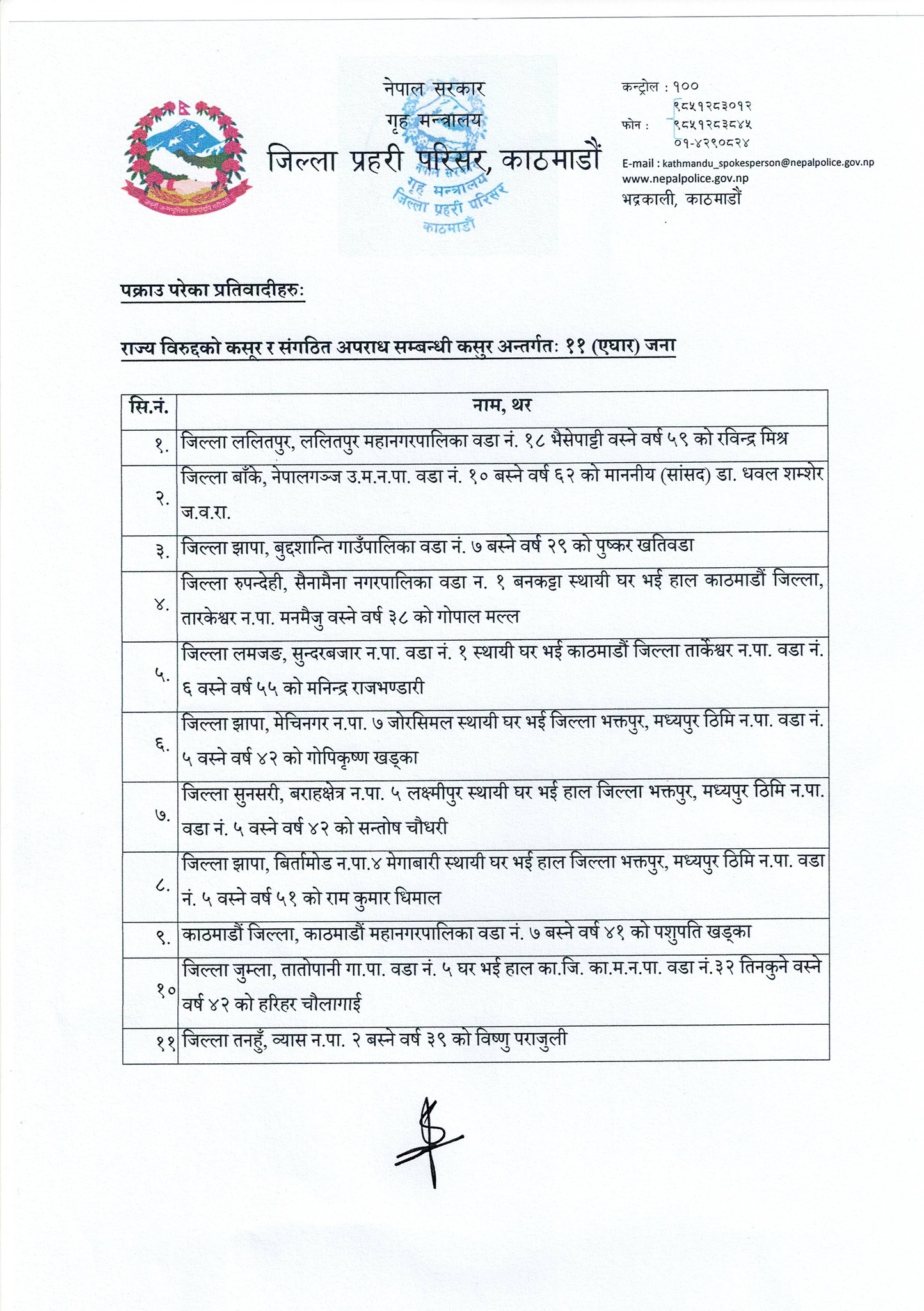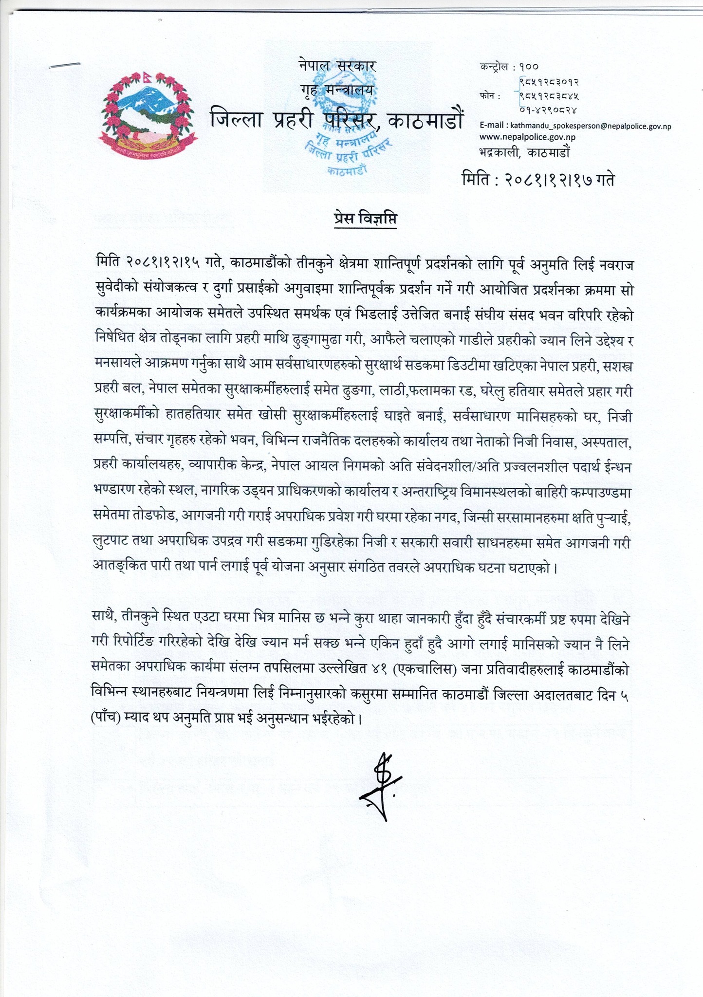 जिल्ला अदालत काठमाडौंले शुक्रबार यता पक्राउ परेका सबैलाई मंगलबारसम्म थुनामा राख्न पहिलोपटक अनुमति दिएको छ।