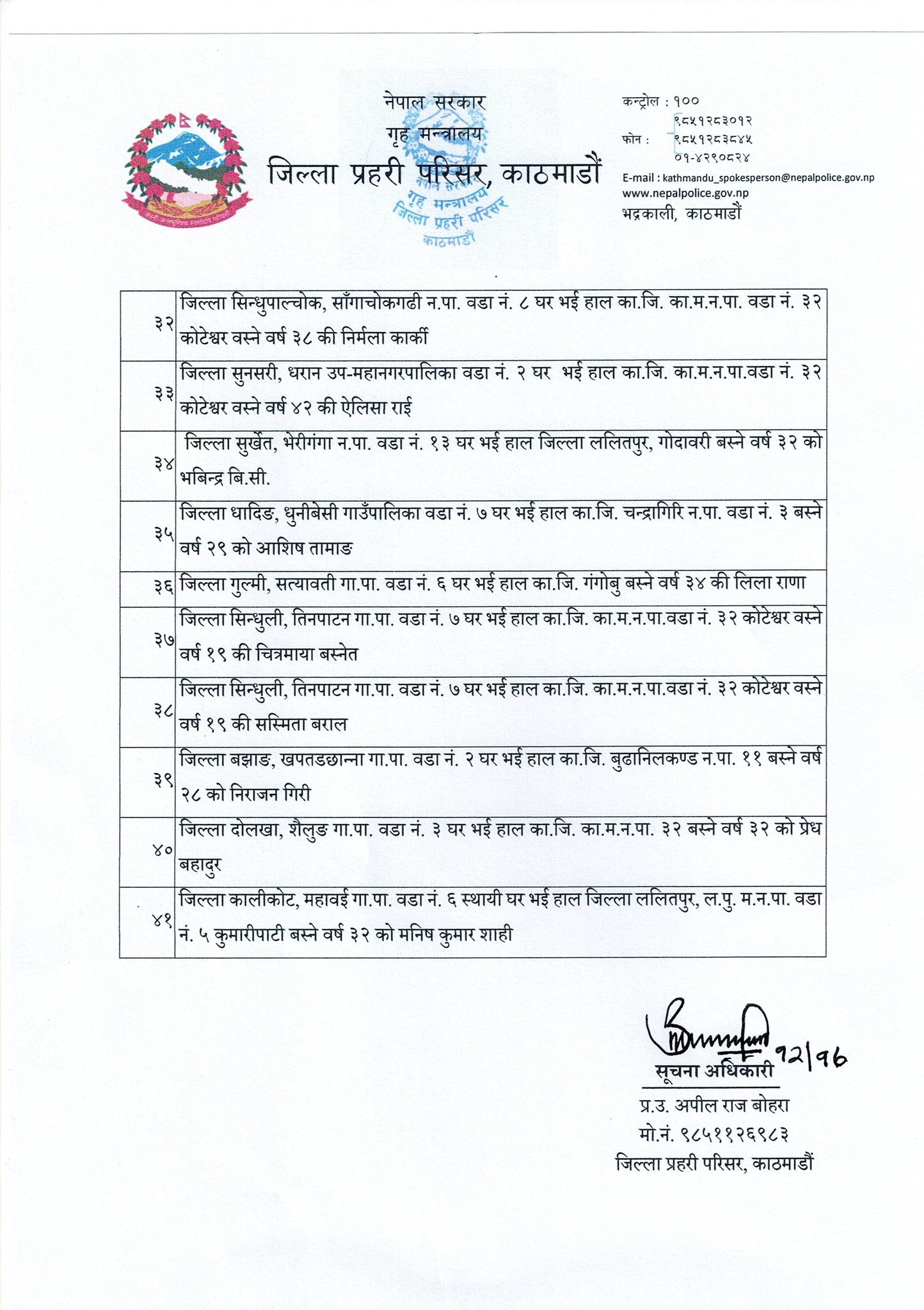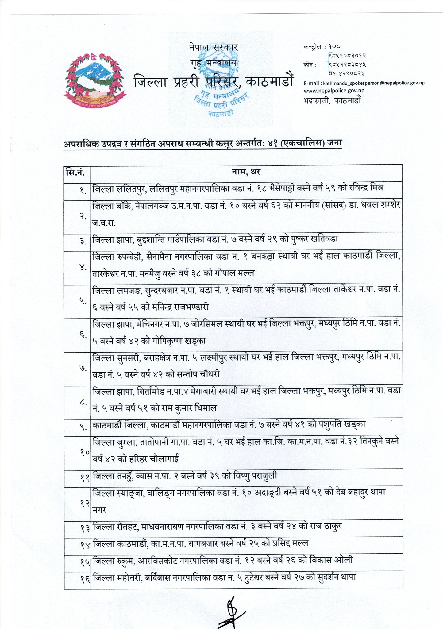 जिल्ला प्रहरी परिसर काठमाडौंले गत शुक्रबार काठमाडाैंको तीनकुने घटनामा आपराधिक गतिविधि गरेको आरोपमा ४१ जनाविरुद्ध अनुसन्धान अगाडी बढाएको छ।