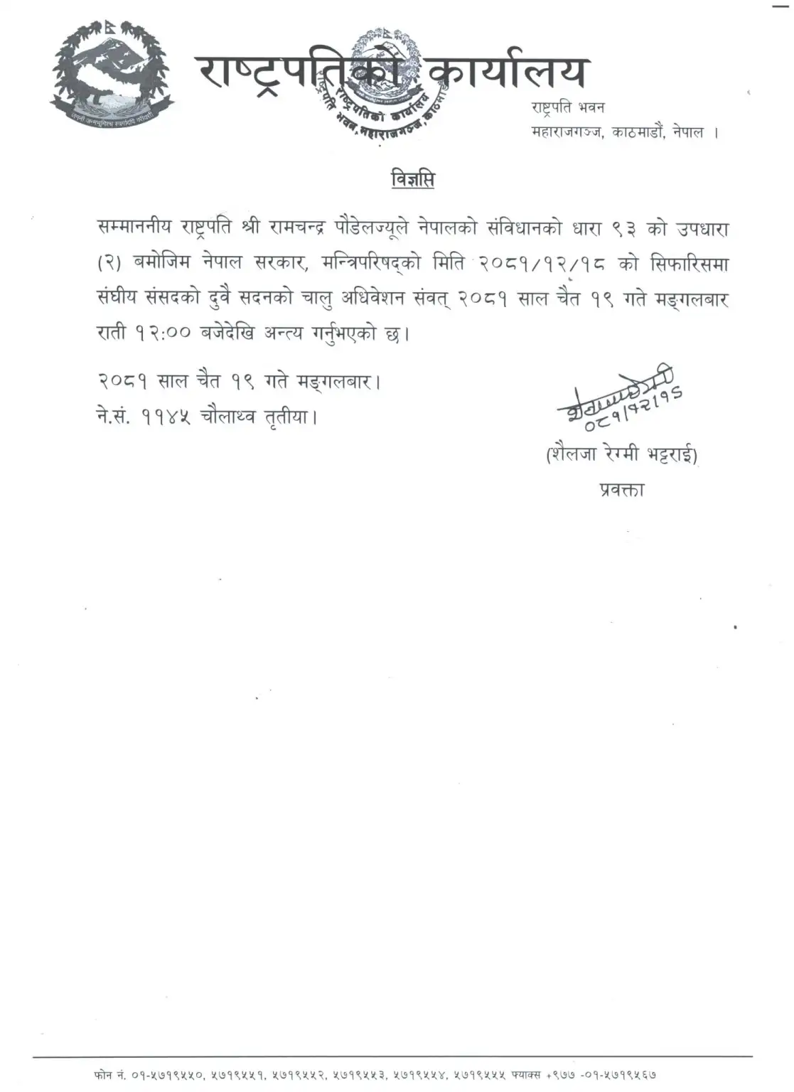 नेपालको संविधानको धारा ९३ को उपधारा (२) बमोजिम मन्त्रिपरिषद्को सिफारिसमा राष्ट्रपतिले दुवै सदनका चालु अधिवेशन अन्त्य गरेका हुन् ।