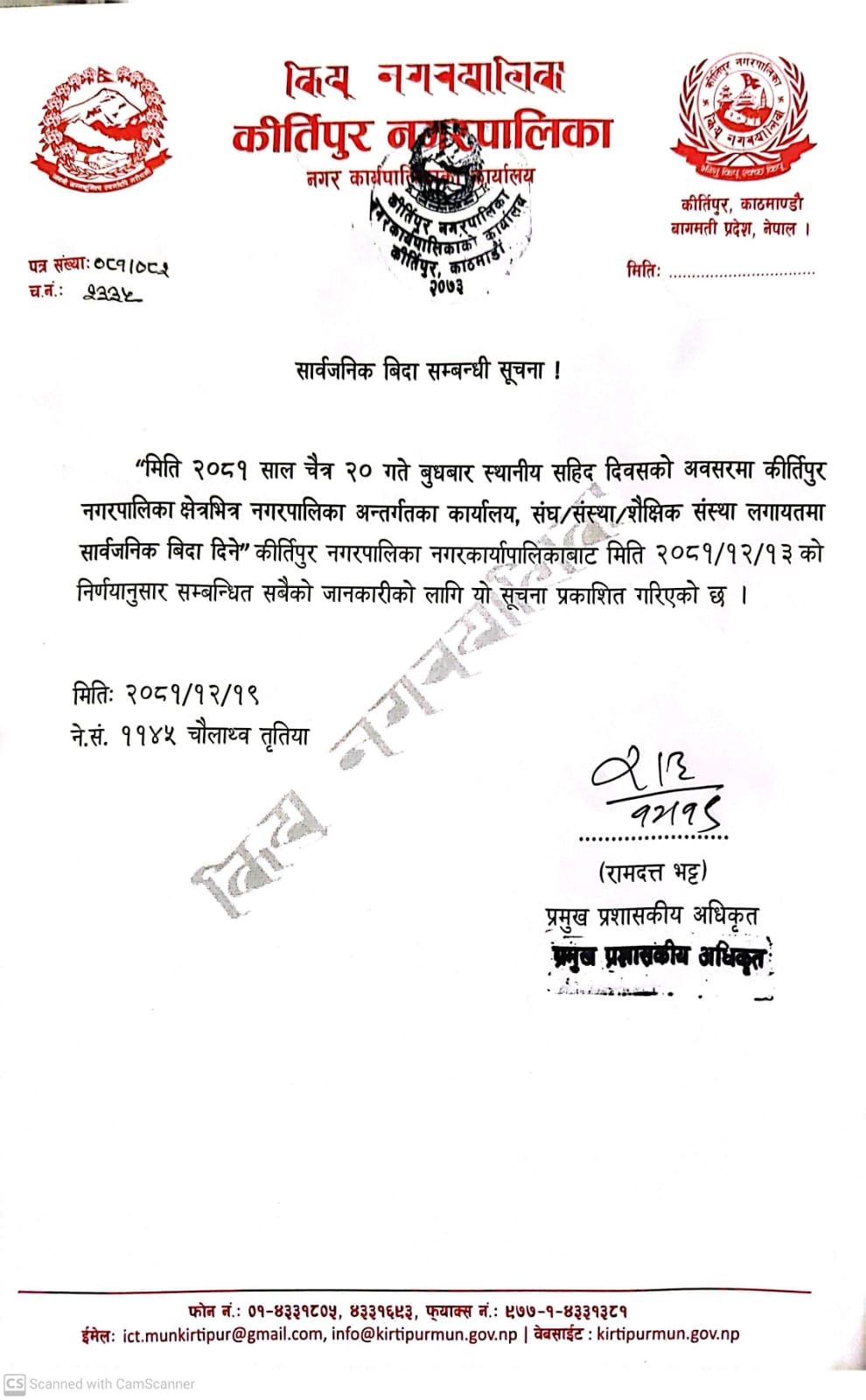 स्थानीय शहीद दिवसका अवसरमा कीर्तिपुर नगरपालिकाले आज बुधबार नगरक्षेत्रमा स्थानीय बिदा दिने निर्णय गरेको छ ।