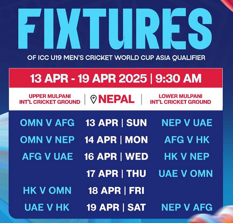 आईसीसी १९ वर्षमुनिको पुरुष क्रिकेट विश्वकप एशिया छनोट प्रतियोगिताको तालिका सार्वजनिक भएको छ ।