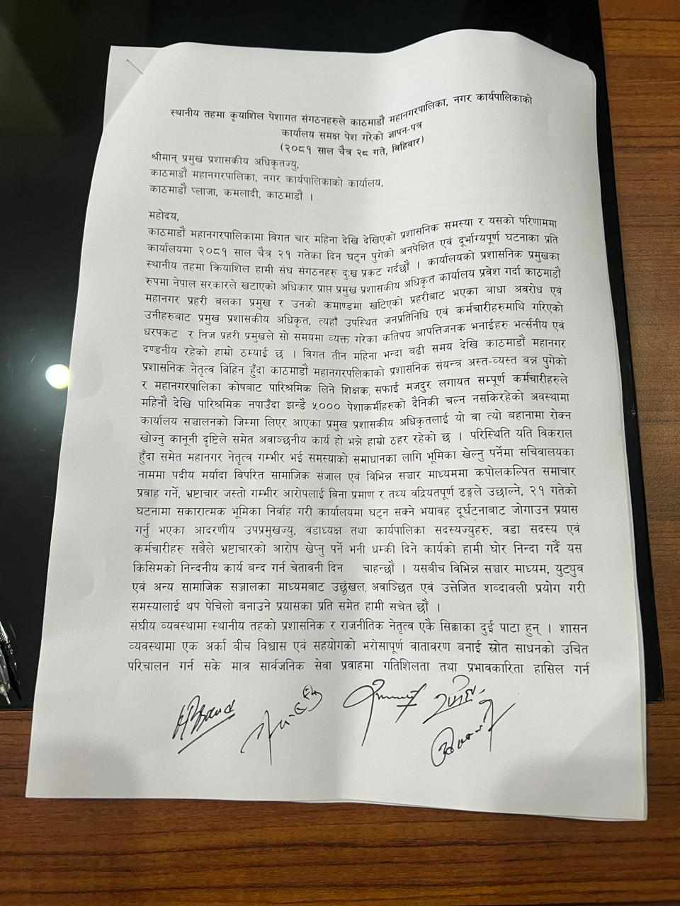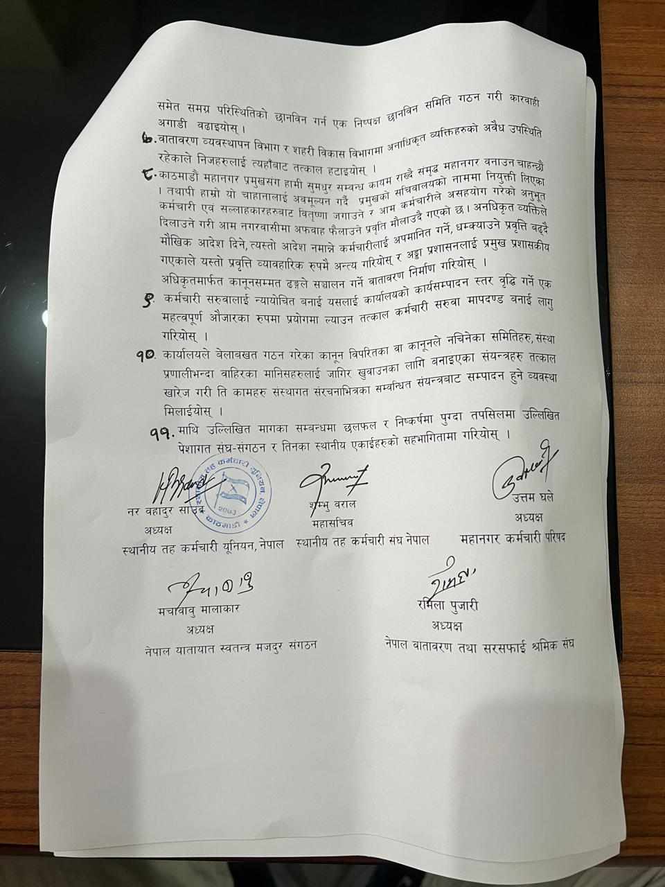 ज्ञापनपत्रमा स्थानीय तह कर्मचारी युनियनका अध्यक्ष नरबहादुर साउद, स्थानीय तह कर्मचारी संघका महासचिव शम्भु बराल, महानगर कर्मचारी परिषद्का अध्यक्ष उत्तम घले, यातायात स्वतन्त्र मजदुर संगठनका अध्यक्ष मचाबाबु मलाकार र वातावरण तथा सरसफाइ श्रमिक संघकी अध्यक्ष रमिला पराजुलीले हस्ताक्षर गरेका छन् ।